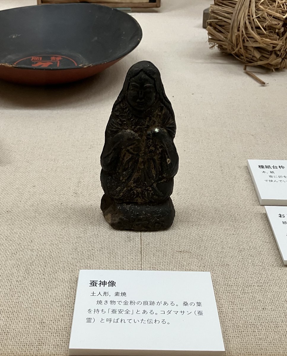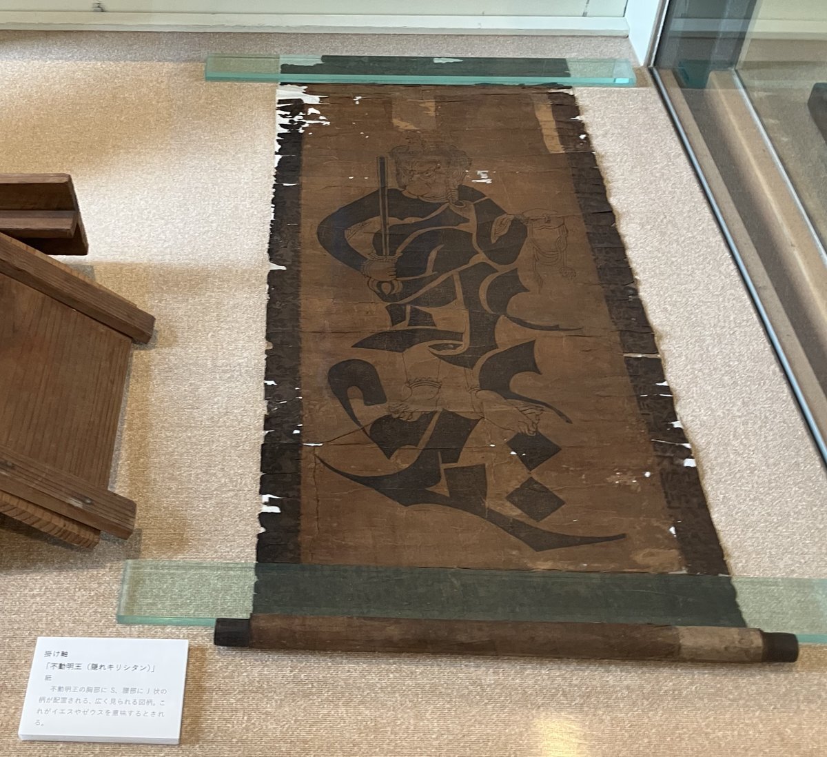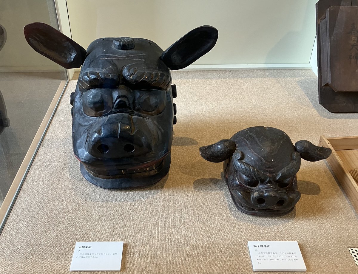 その他、気になった展示資料。 1⃣蚕神像 2⃣犬神楽面(左)と獅子神楽面(右) 3⃣棟ひな箱:その昔、新築の屋根裏に設置された魔除けの人形入りの箱 4⃣隠れキリシタンの不動明王掛け軸:体の一部にSやJがデザインされているそうです #しばたの郷土館 #宮城に生きる民俗 #仙南のくらしと道具 pic.x.com/47NfzJS8jH