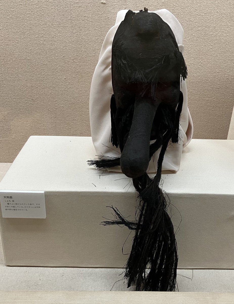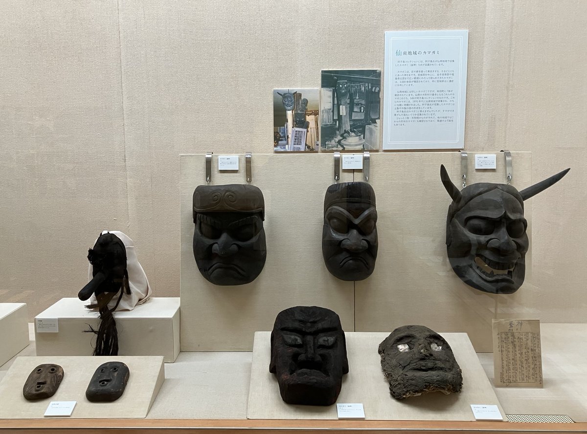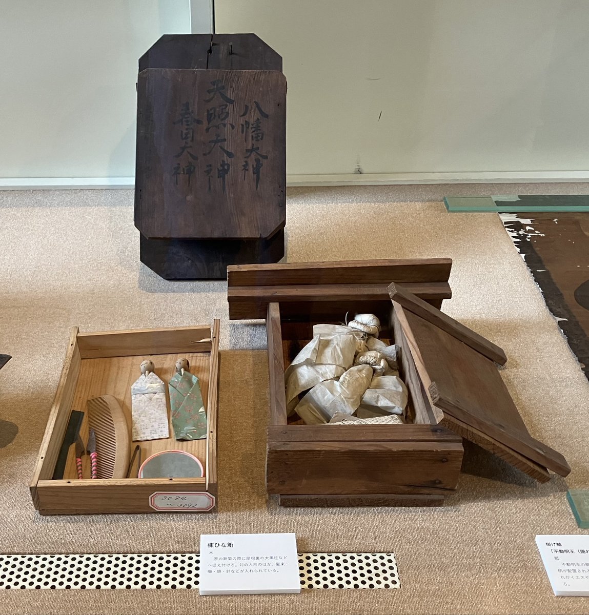 その他、気になった展示資料。 1⃣蚕神像 2⃣犬神楽面(左)と獅子神楽面(右) 3⃣棟ひな箱:その昔、新築の屋根裏に設置された魔除けの人形入りの箱 4⃣隠れキリシタンの不動明王掛け軸:体の一部にSやJがデザインされているそうです #しばたの郷土館 #宮城に生きる民俗 #仙南のくらしと道具 pic.x.com/47NfzJS8jH