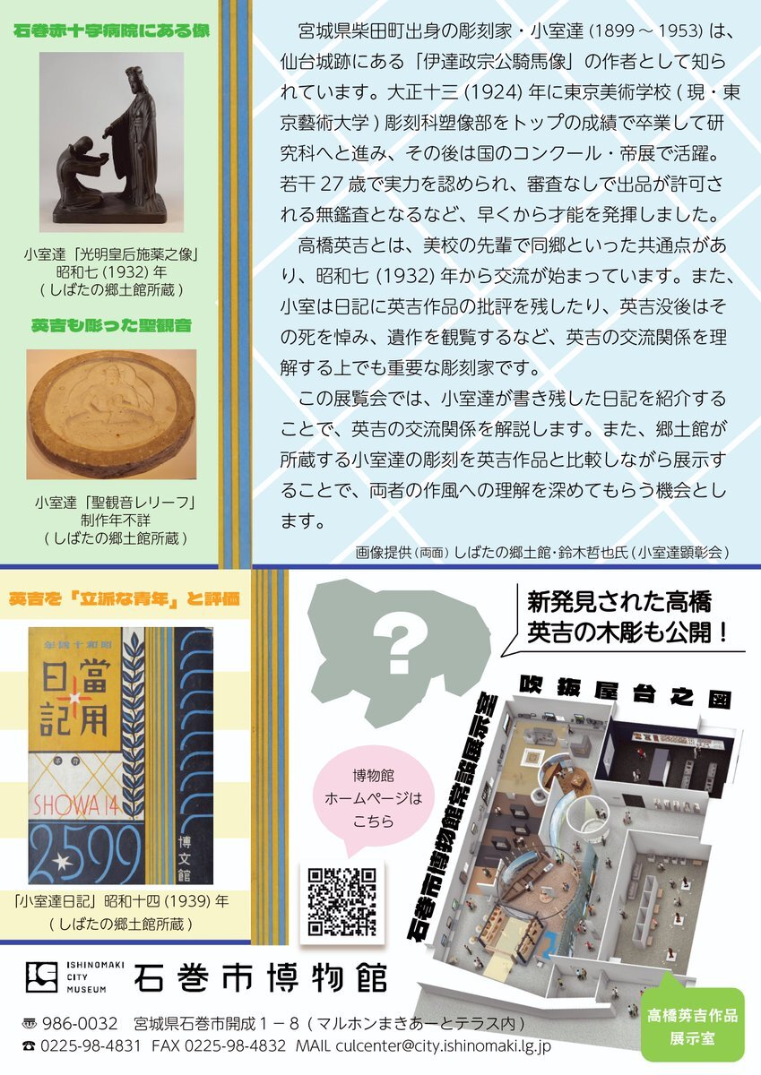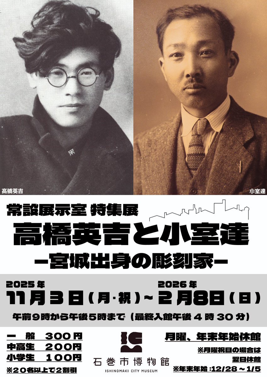 11月3日🎌は開館4周年記念イベントを行います🎊🙌 なんと常設・企画展が無料に👀 さらに、高橋英吉の特集展が始まります!🎉 仙台城跡にある「伊達政宗公騎馬像」🏇を作った柴田町出身の彫刻家・小室達(とおる)と英吉の交流を特集。 #しばたの郷土館 から小室の作品や日記を借用展示します。 pic.x.com/4mLxLwmzBy
