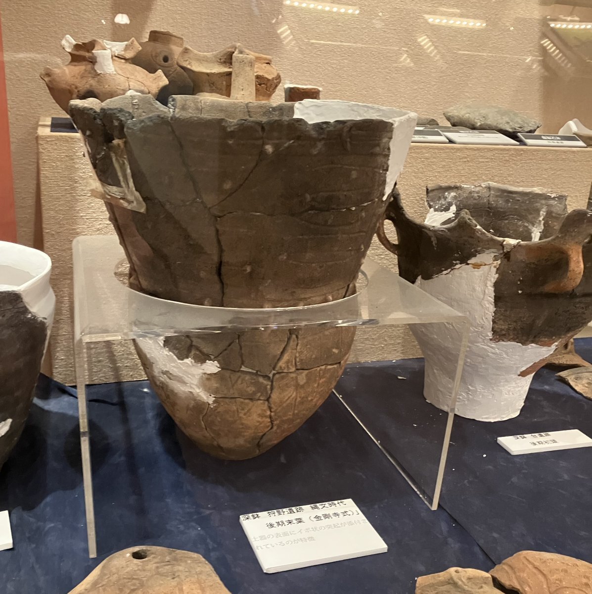 縄文土器は西方前遺跡から出土した中期末葉~後期初頭の2点が展示されています。1⃣は典型的な埋甕用土器で、底に孔が穿たれています。 #三春町歴史民俗資料館