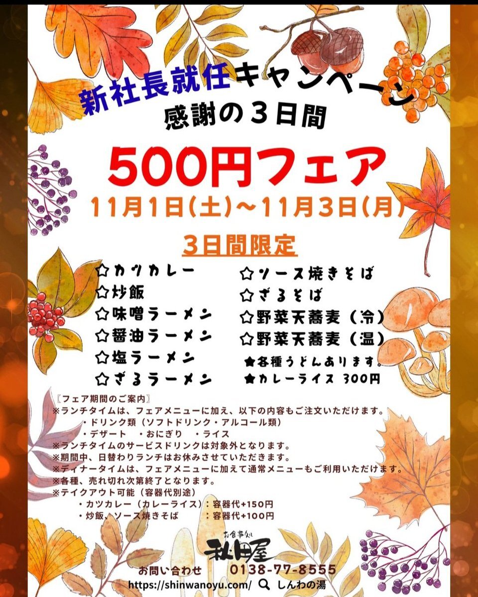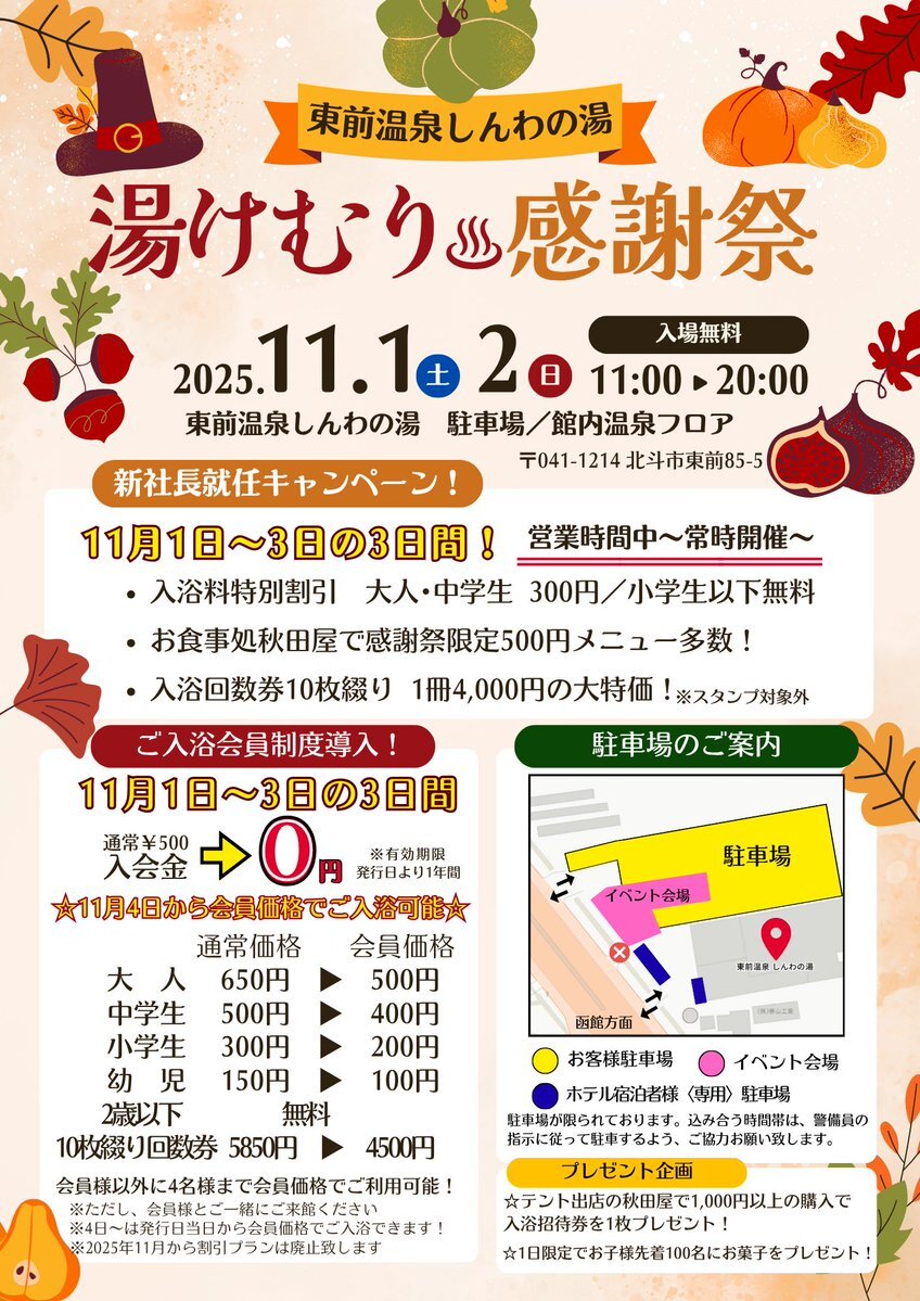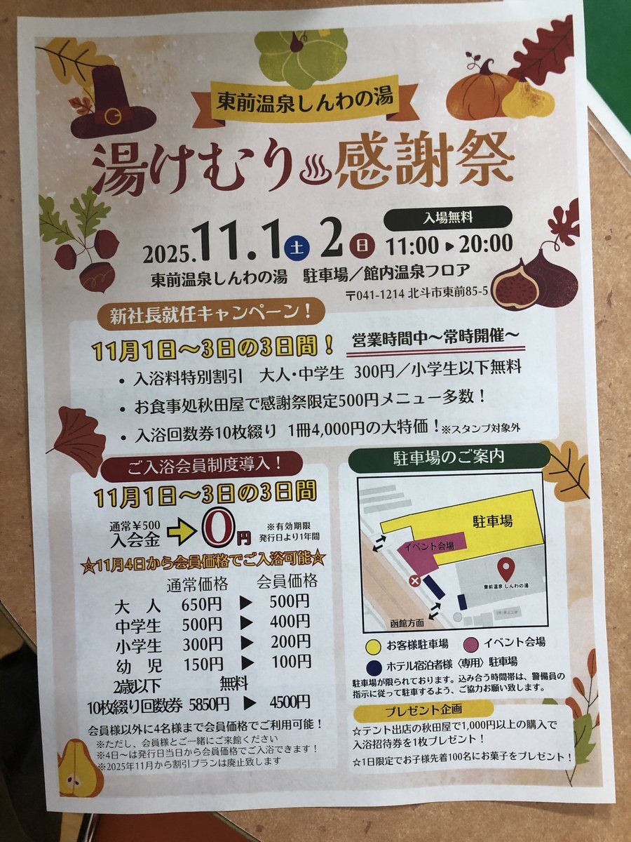 【湯けむり感謝祭】 11/1〜3限定!東前温泉しんわの湯で特別イベント開催♨️ ☆新社長就任キャンペーン 💰入浴特別割引300円、小学生以下無料 🍽️秋田屋の限定メニュー500円! ☆1~2日は外と館内で色んな出店!催し物も! ☆入浴会員制導入! 入会金無料!3日間の内に入会すると4日から会員価格に!
