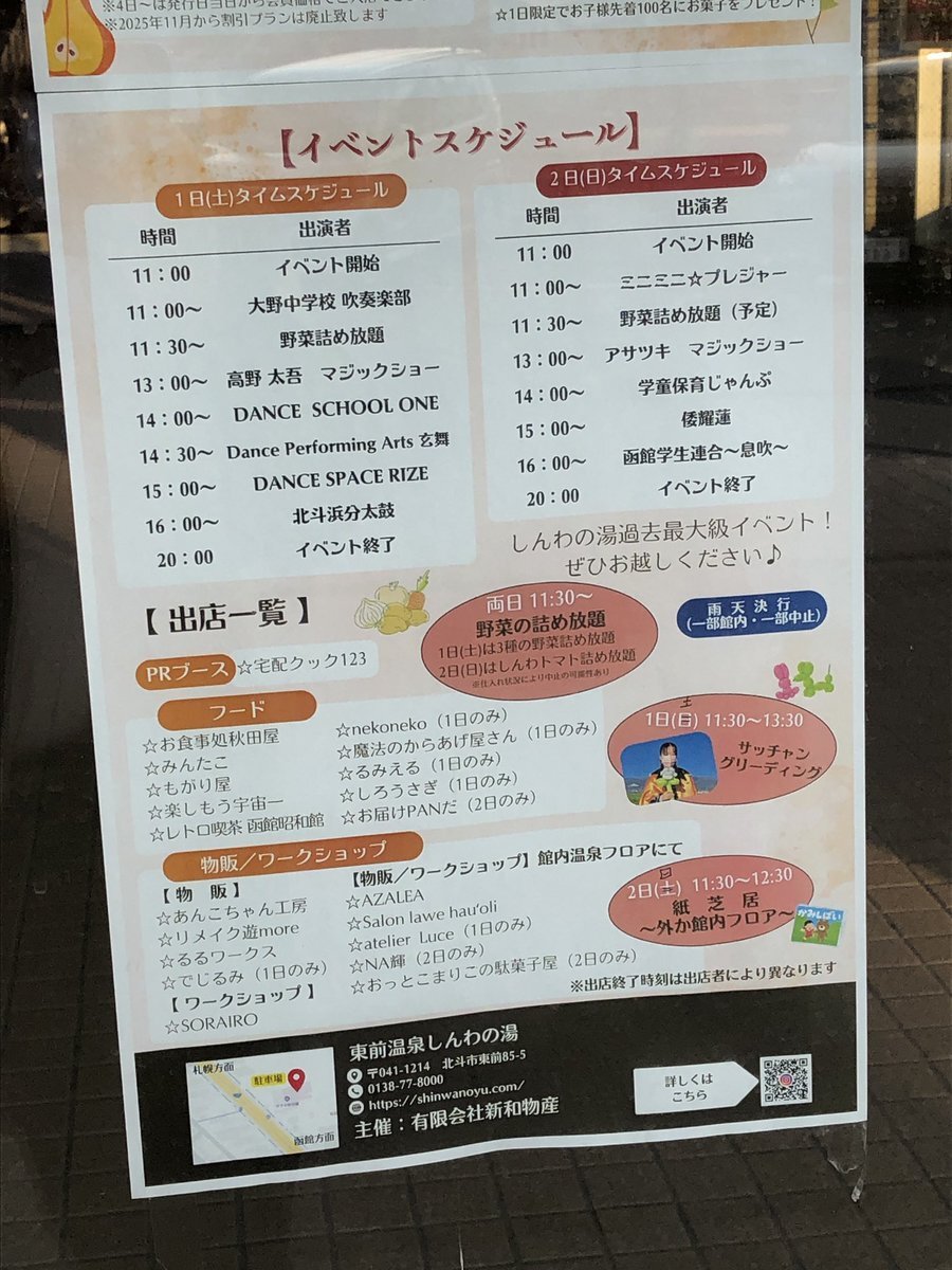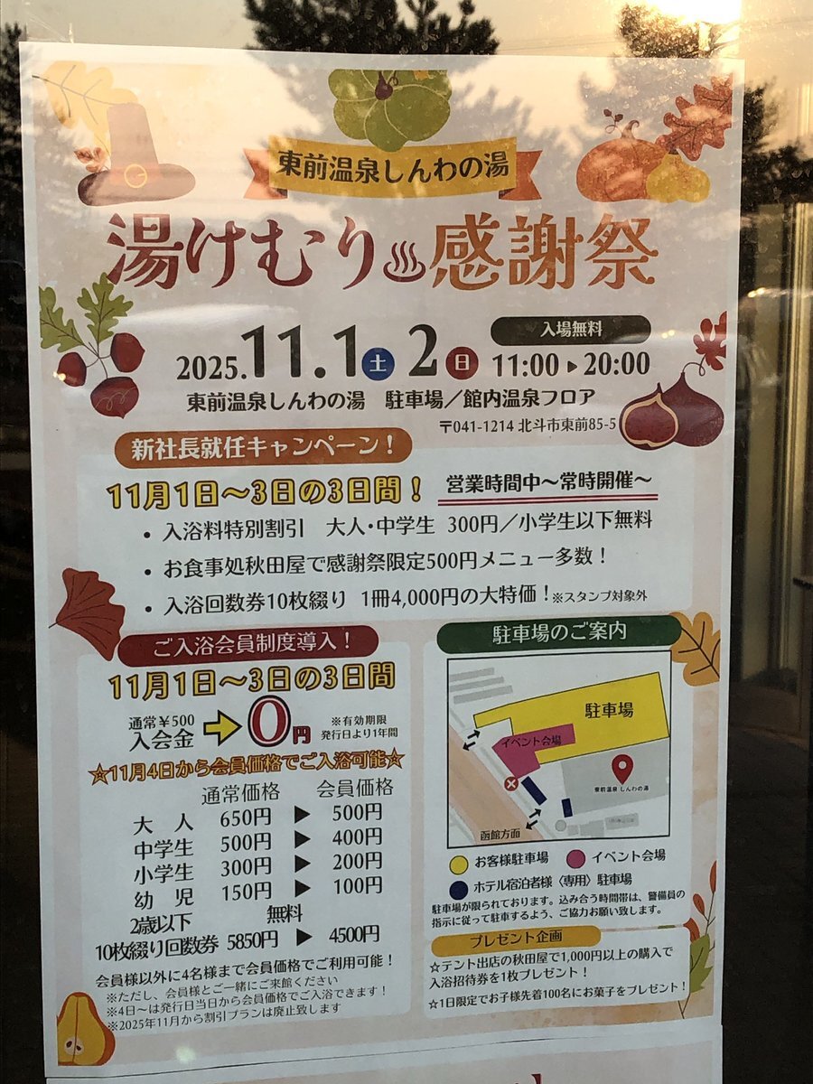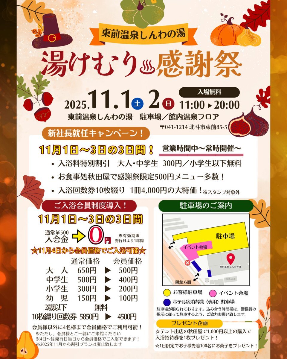 【湯けむり感謝祭】 11/1〜3限定!東前温泉しんわの湯で特別イベント開催♨️ ☆新社長就任キャンペーン 💰入浴特別割引300円、小学生以下無料 🍽️秋田屋の限定メニュー500円! ☆1~2日は外と館内で色んな出店!催し物も! ☆入浴会員制導入! 入会金無料!3日間の内に入会すると4日から会員価格に!