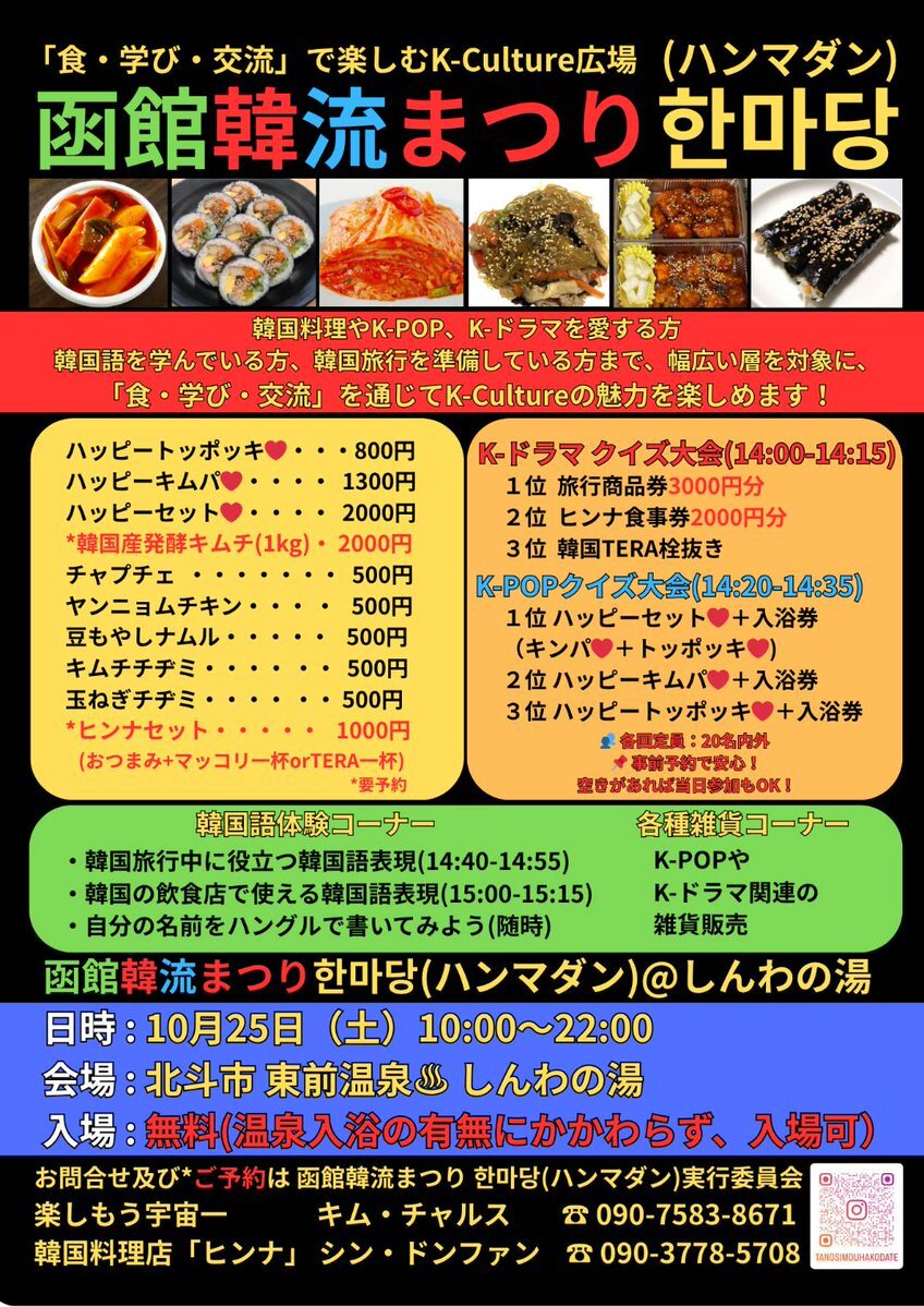25日土曜日はしんわの湯さんにて「函館韓流まつりハンマダン한마당」を開催!フード、ドリンクは売り切れ御免となっております。楽しい場になれば、と思ってます!よろしくお願いいたします!※ヒンナ店舗はお休みです。 #函館研究所 #ヒンナ #函館韓流まつりハンマダン #楽しもう宇宙一 #しんわの湯 pic.x.com/0mjSao4xMy