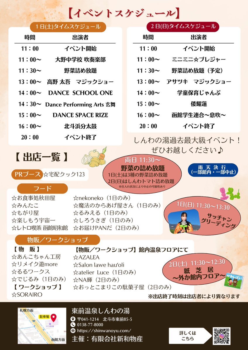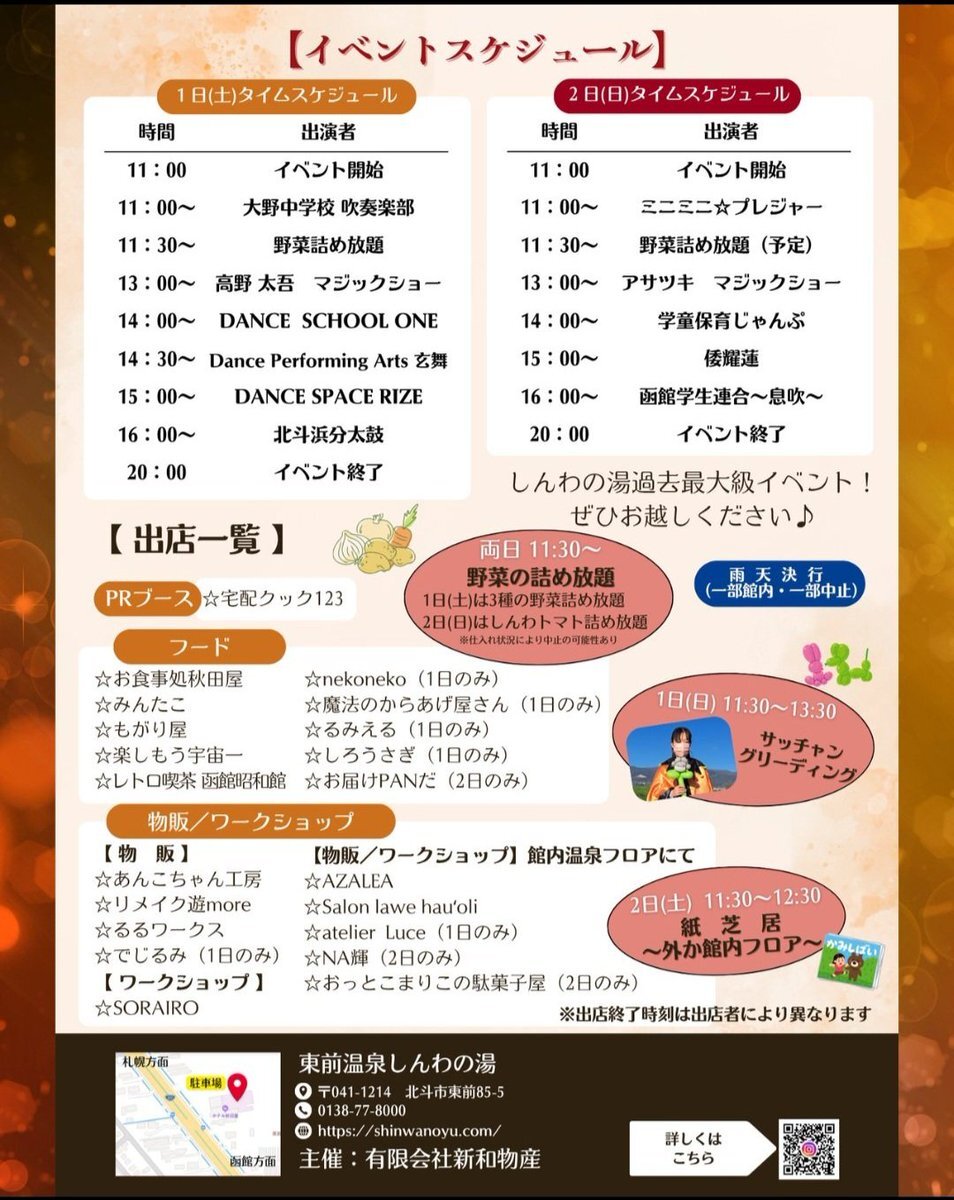 11月1.2日は「しんわの湯」さんのイベント✨ 【湯けむり♨️感謝祭】に出店します🐙‼️ 温泉が恋しくなるこの季節に超お得な企画盛り沢山の大イベント🔥 みんたこ以外のフードもいっぱい出店してますので、ぜひ皆さまのご来場お待ちしてますー🐙✨ #函館 #北斗市 #しんわの湯 #たこ焼き #温泉 pic.x.com/eXqZkibQYj