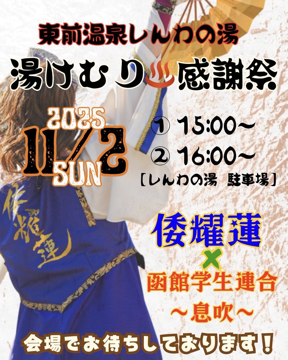 倭耀蓮です🪷 11月2日(日) 東前温泉しんわの湯  湯けむり感謝祭 で演舞させていただきます✨ 15:00〜・16:00〜 の2ステージ! #函館学生連合息吹 さんと共演🥳 今年最後の屋外演舞! 天気が心配ですが🥹🙏 是非お越しください✨ #yosakoiソーラン #北斗市 #しんわの湯 #温泉 #倭耀蓮 pic.x.com/UXLMISEzqa