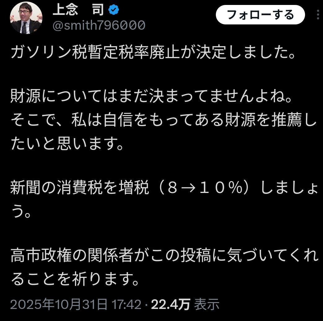 そうだ!公明党が連立から抜けたのだから、新聞紙の税率を8%から10%にすれば良い! NHK受信料も消費税10%なのだから、、、 x.com/smith796000/st…