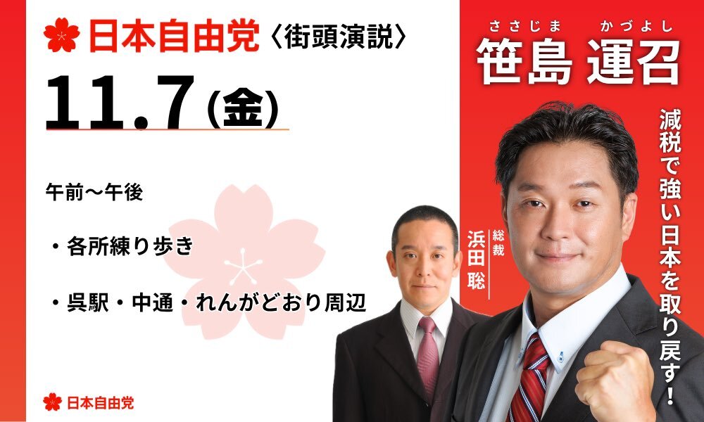 おはようございます☀️ 選挙活動ができるのは明日まで。 残り2日、悔いのないよう全力で駆け抜けます! #呉市議会議員補欠選挙 #呉市 #笹島運召 #運を呼ぶ男
