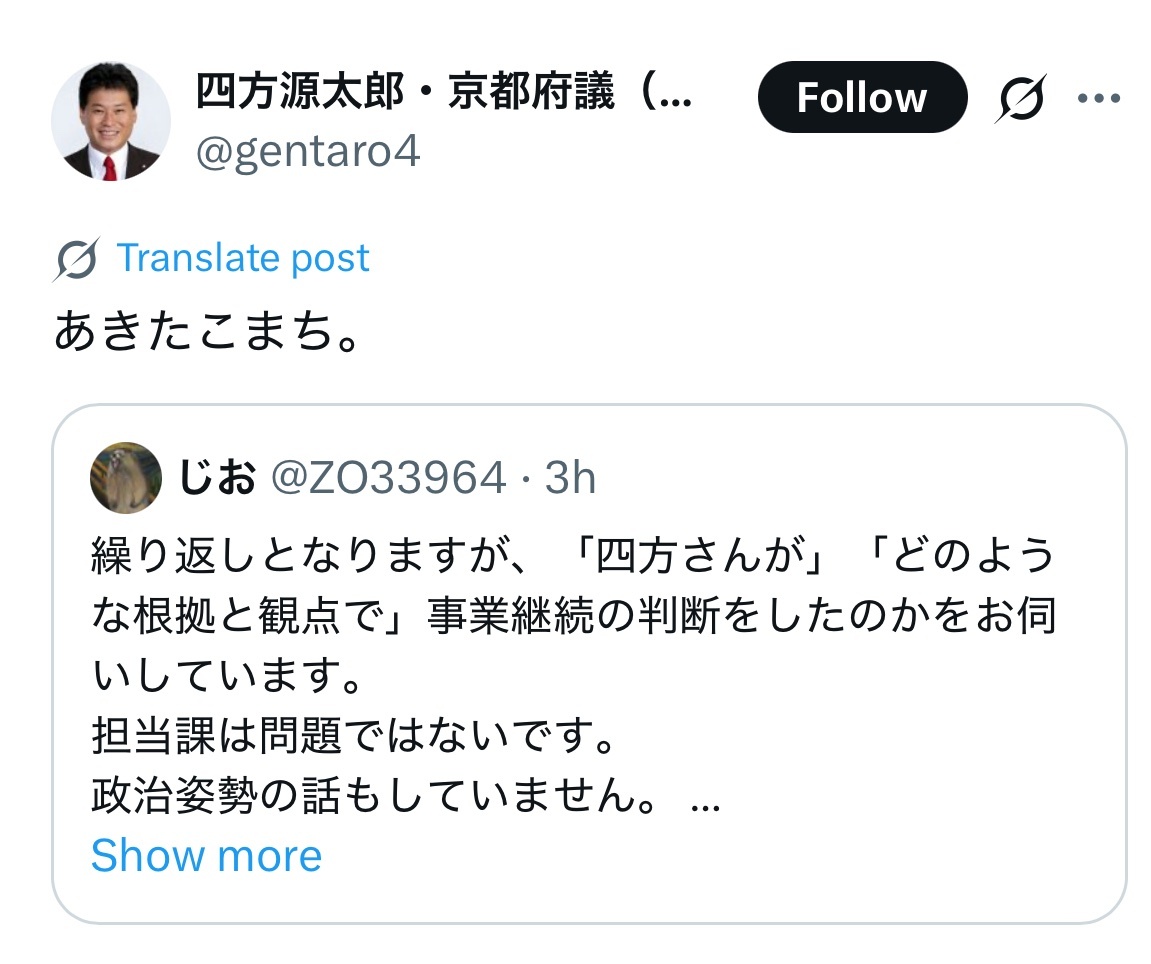 綾部市市長選挙に立候補している四方源太郎氏は、税の使い方について説明を求めるSNSでの声に対して真面目に回答しない方なので、本当に無駄を省いて市民サービス向上に真面目に取り組んでくれるかも疑ったほうがよいと思われます。 #四方源太郎 #京都府議 #綾部市 #すべての増税に反対 pic.x.com/aaFEacYdRj x.com/kyoto_np/statu…