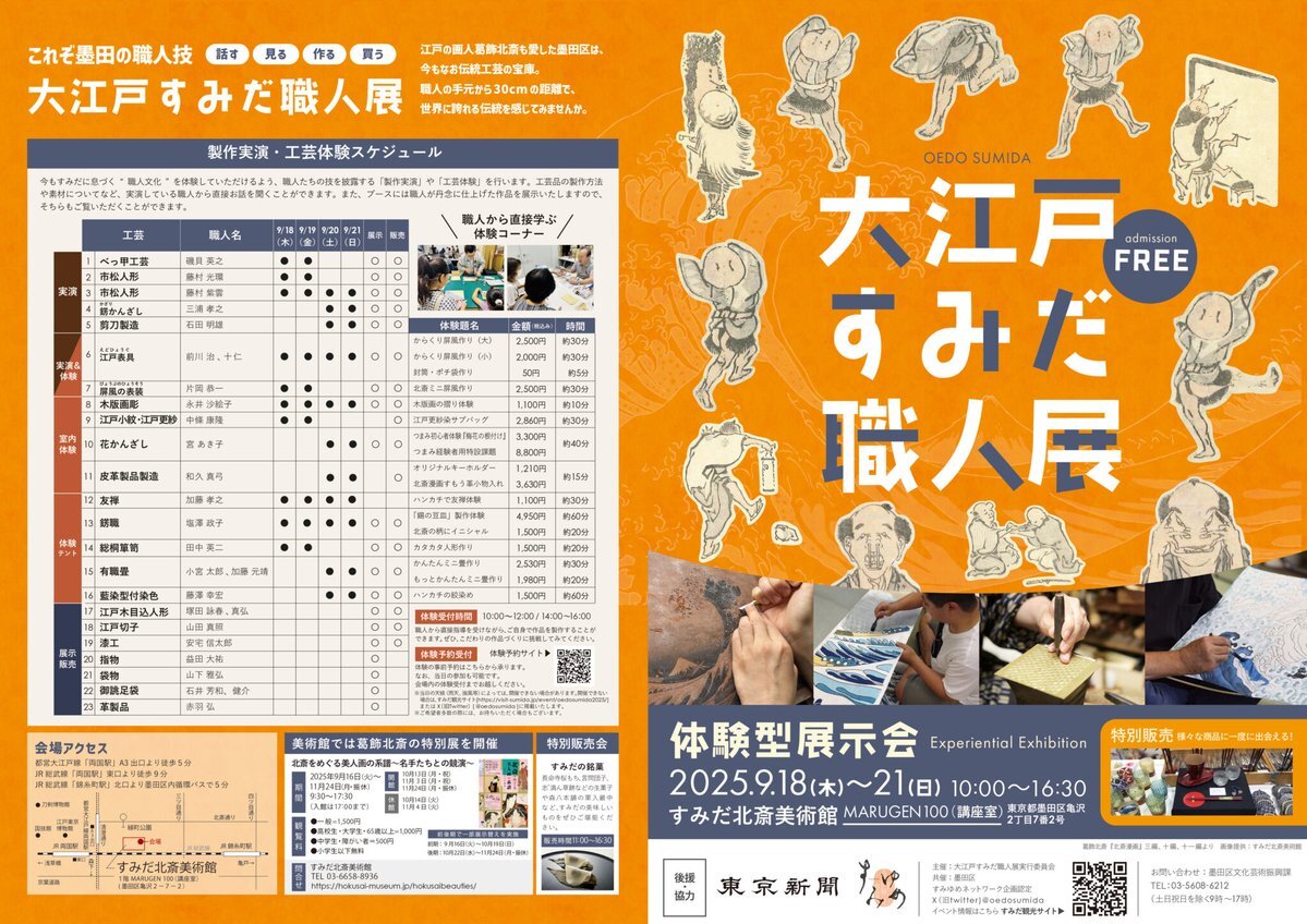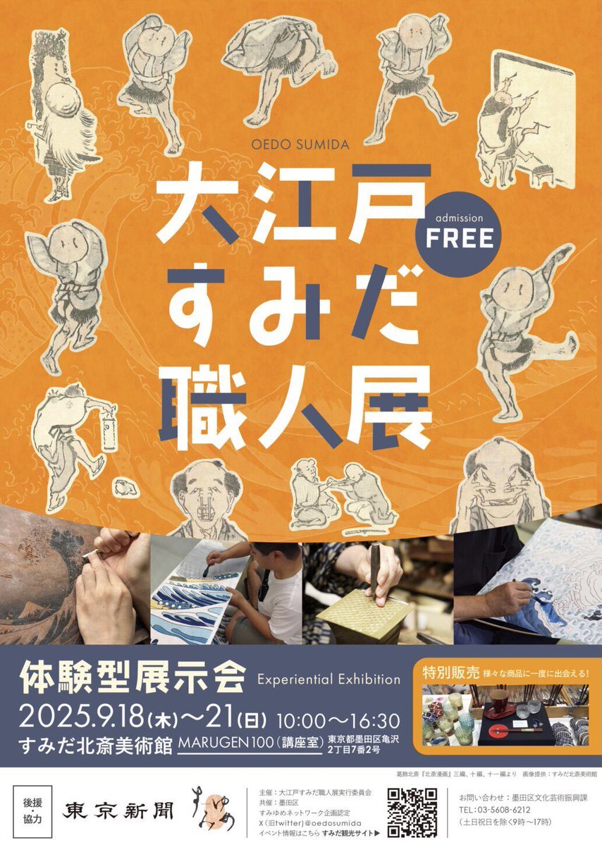 \\今年も開催!大江戸すみだ職人展🌟// 今もすみだに息づく“職人文化”を、職人による実演や体験にてお楽しみいただけます! 世界に誇る伝統の体験型展示会へ、ぜひお越しください🙌🏻✨ 🔹日時 9月18日(木)〜21日(日) 10:00〜16:30 🔹場所 すみだ北斎美術館MARUGEN100 visit-sumida.jp/event/oedosumi…