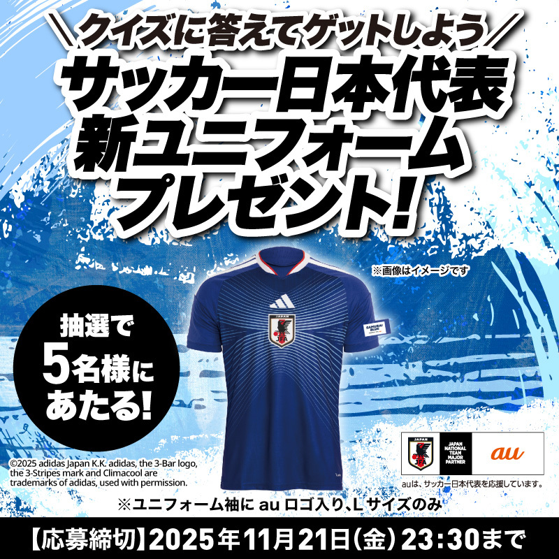 / #サッカー日本代表 新ユニフォーム プレゼントキャンペーン👕✨ \ 投稿内の3つのクイズに答えると【サッカー日本代表新ユニフォーム(auロゴ入り)※Lサイズ】が抽選で5名様に当たる!🎁 ⚽応募方法⚽ 1️⃣@au_official をフォロー 2️⃣本投稿に3つのクイズの回答をリプライ
