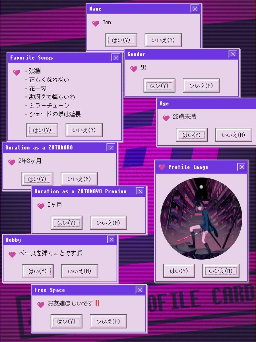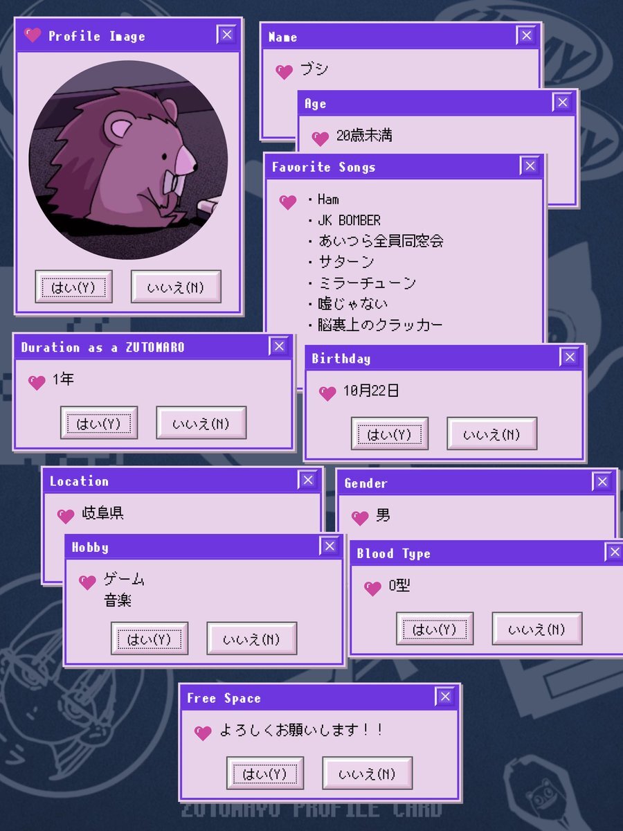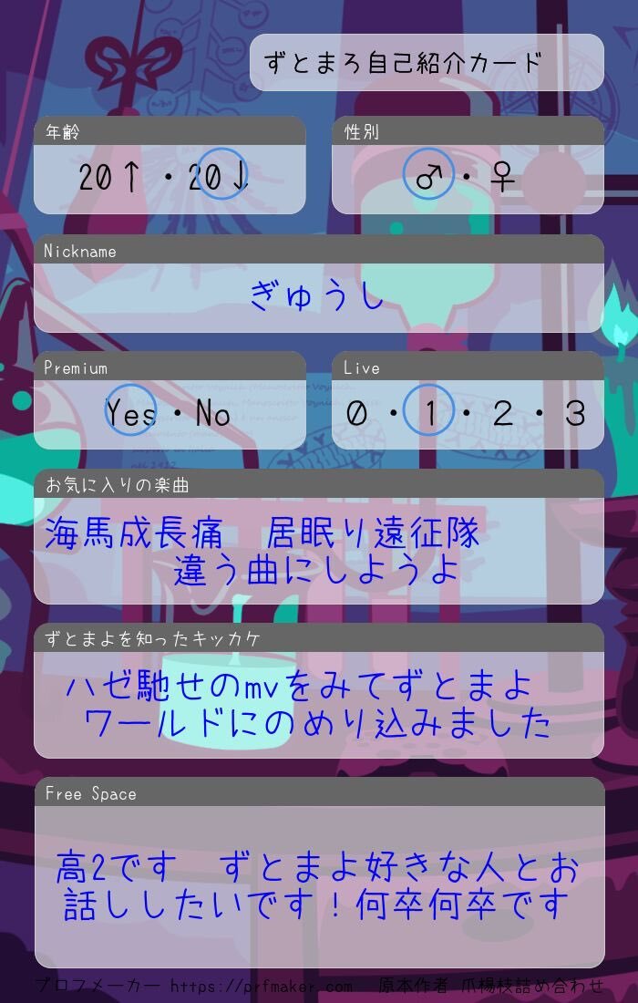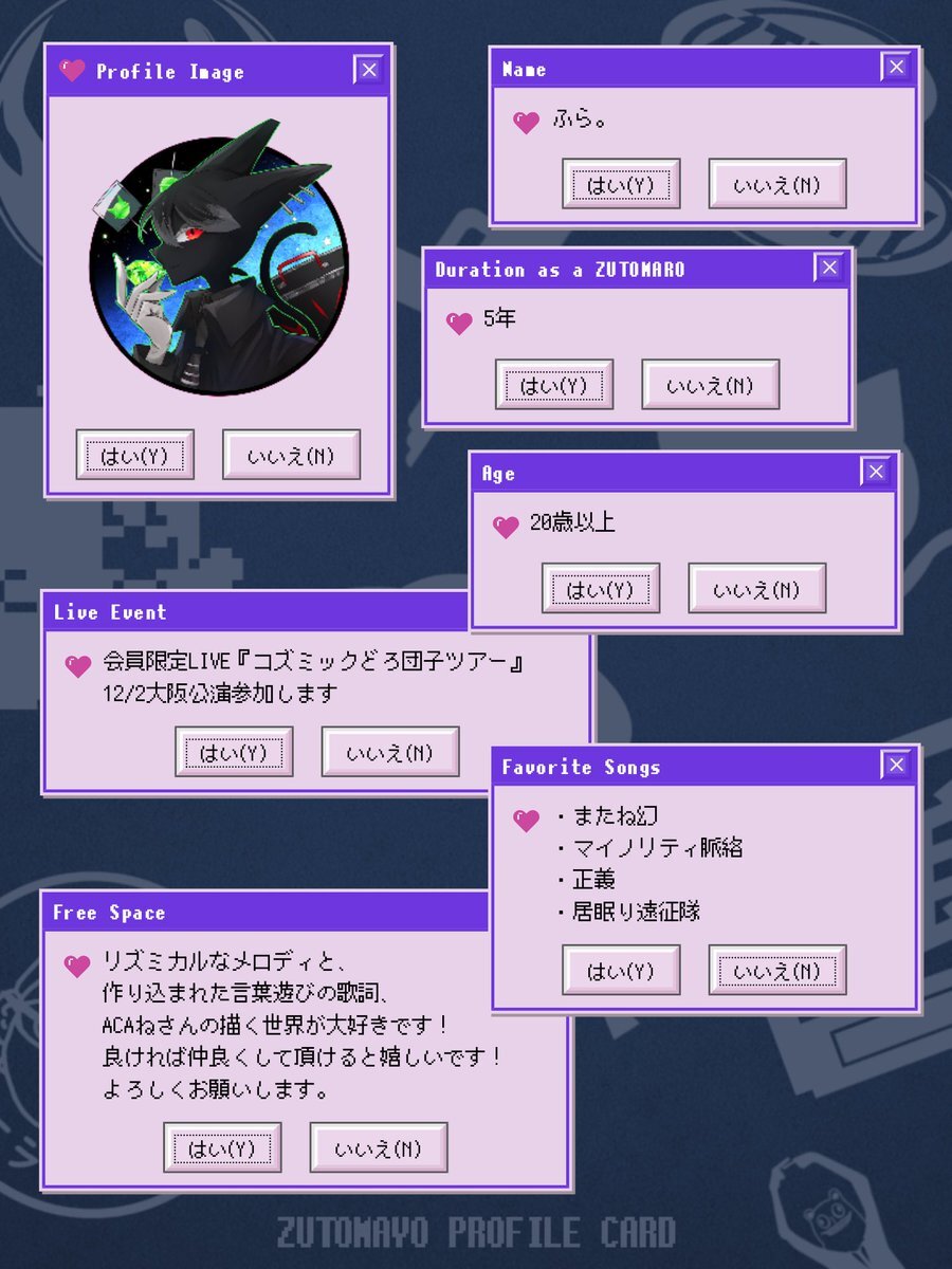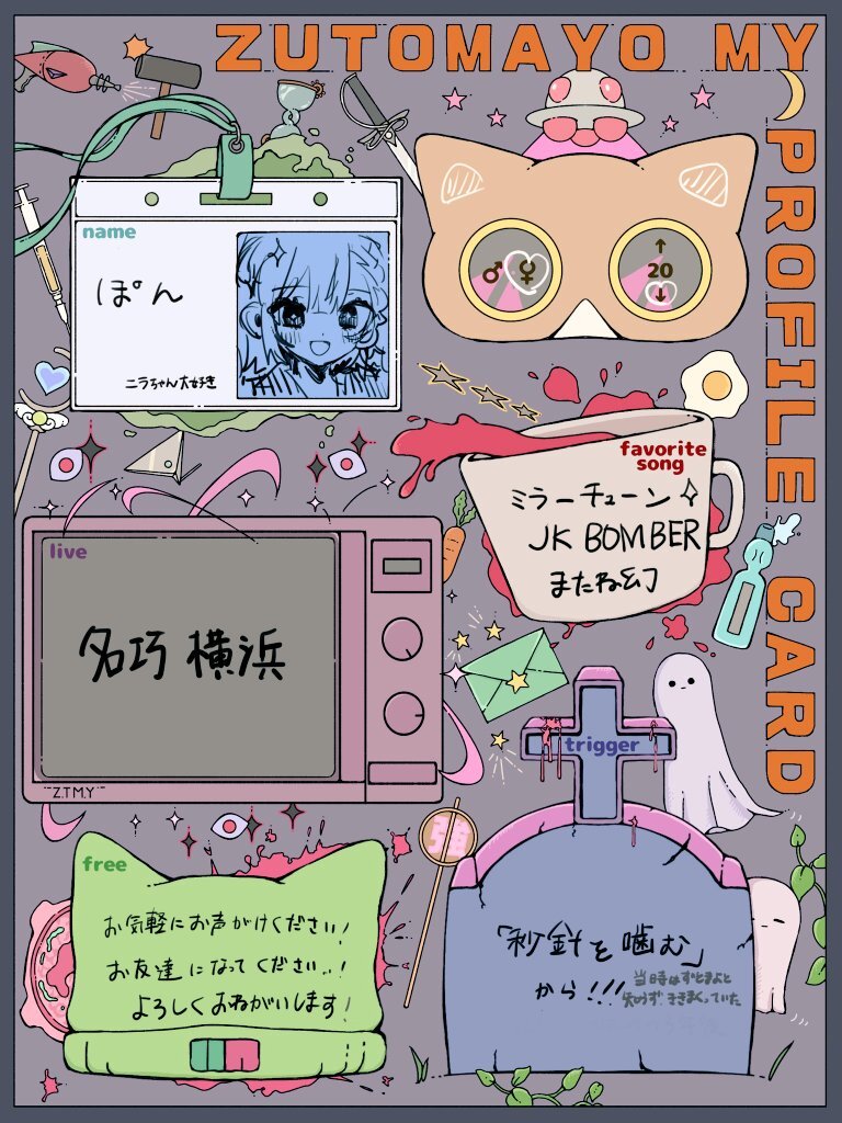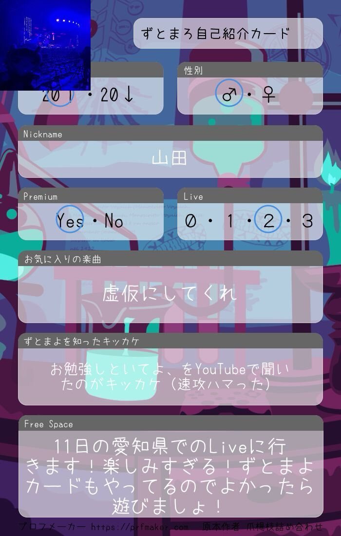 アカウントを作って1ヶ月経ったので、自己紹介カードを作ってみました。ずとまよ好きなみなさん、何卒何卒 #ずとまろさんと繋がりたい #ずとまよ好きと繋がりたい #ずとまよ自己紹介カード #ずとまろ自己紹介カード pic.x.com/lylCcp9iEQ