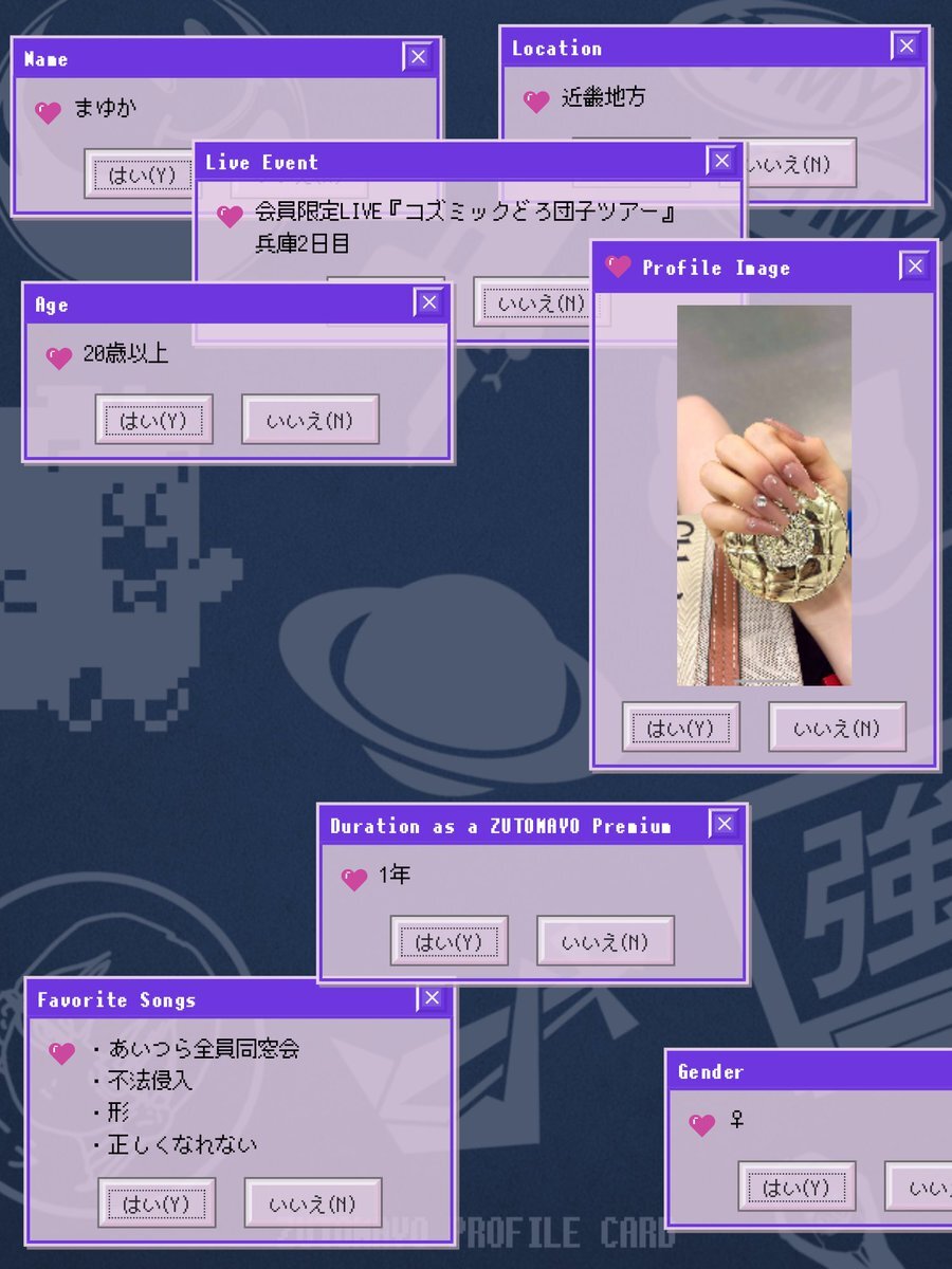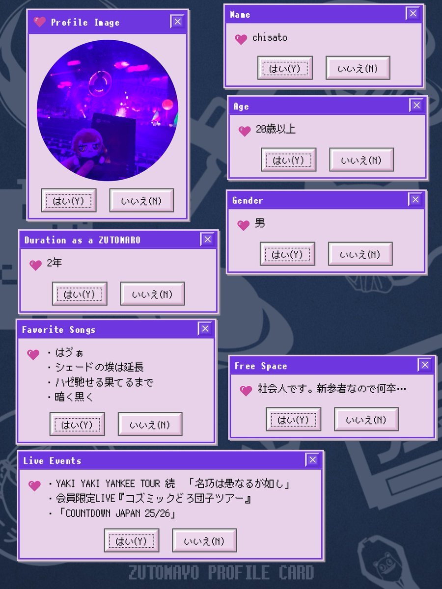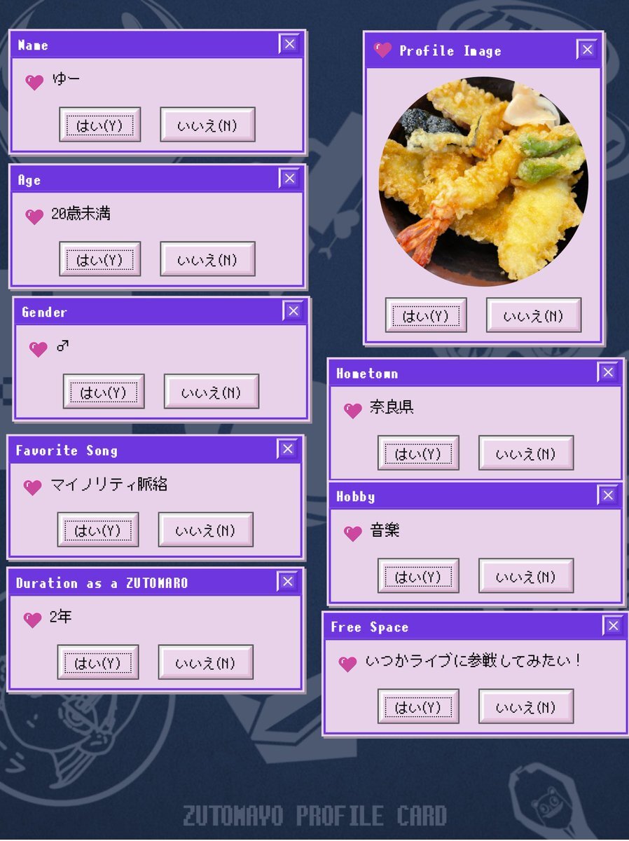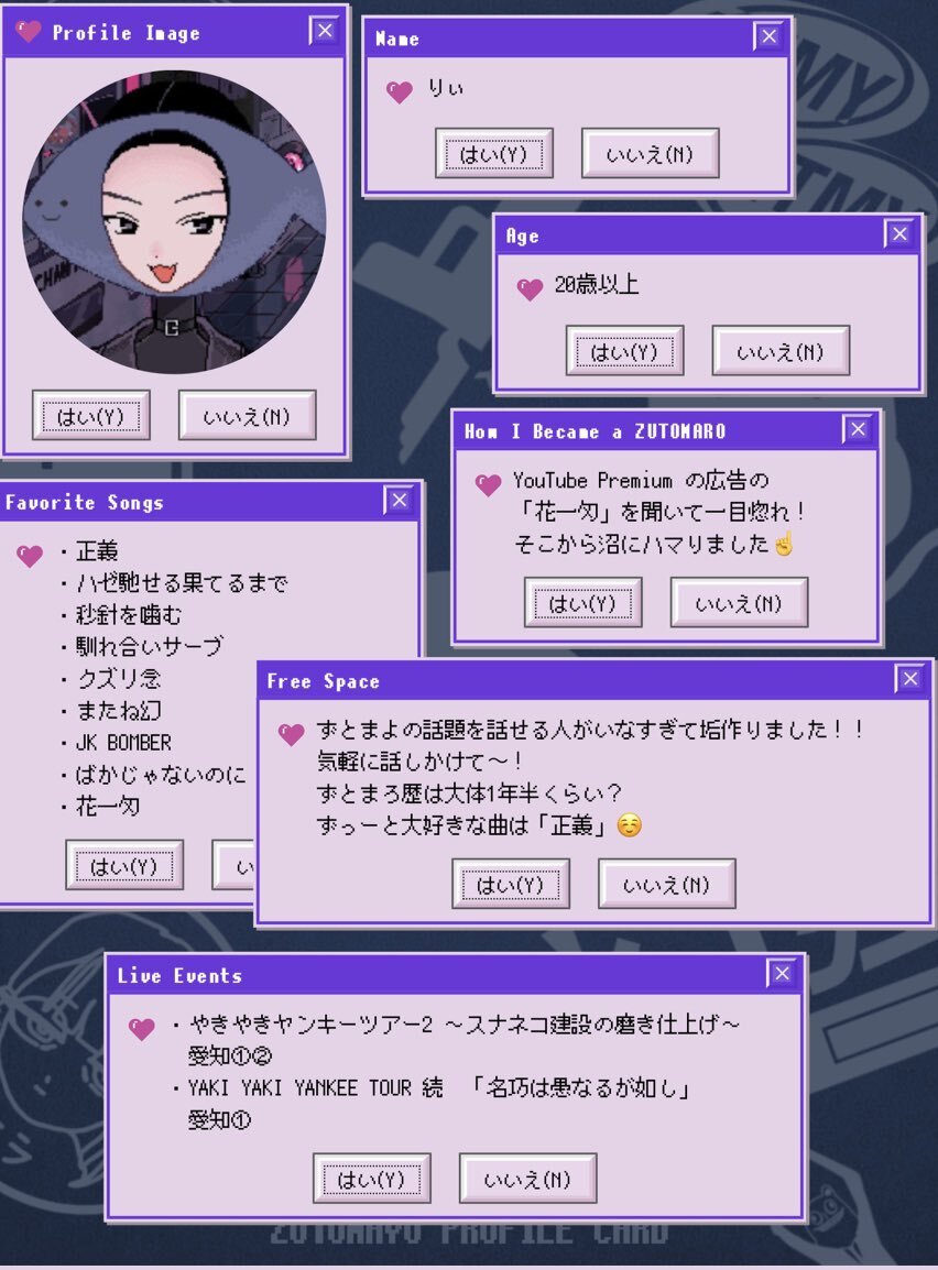 アカウントを作って1ヶ月経ったので、自己紹介カードを作ってみました。ずとまよ好きなみなさん、何卒何卒 #ずとまろさんと繋がりたい #ずとまよ好きと繋がりたい #ずとまよ自己紹介カード #ずとまろ自己紹介カード pic.x.com/lylCcp9iEQ