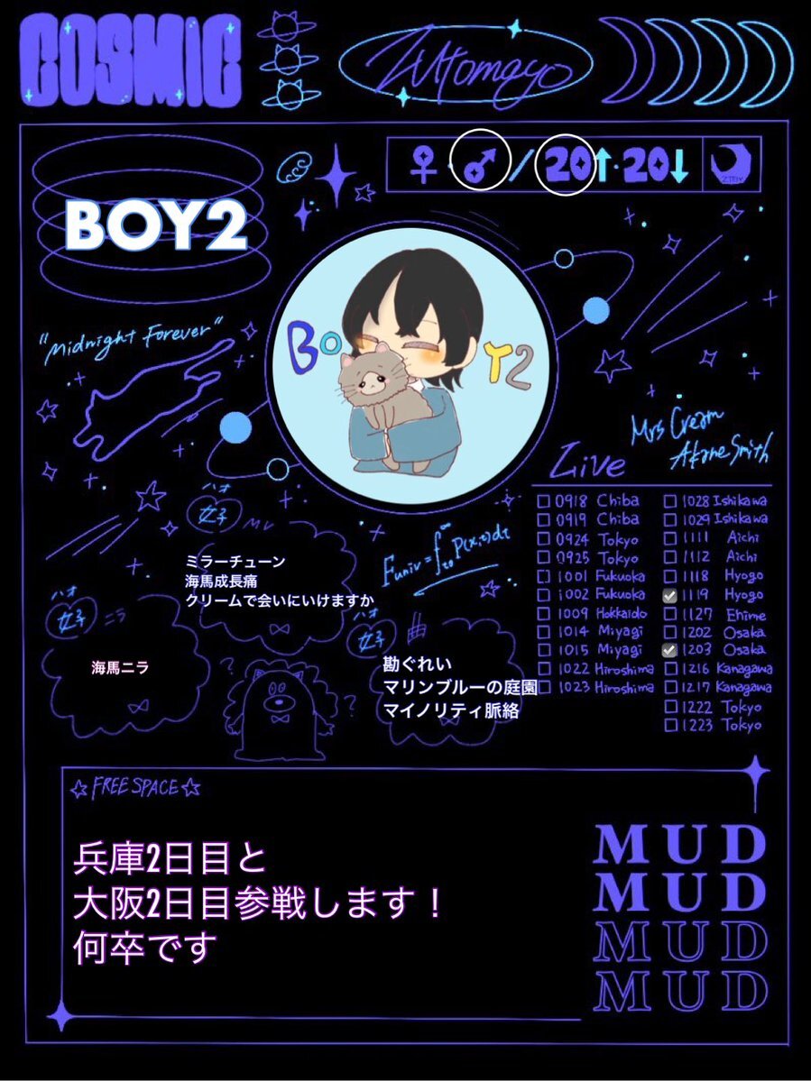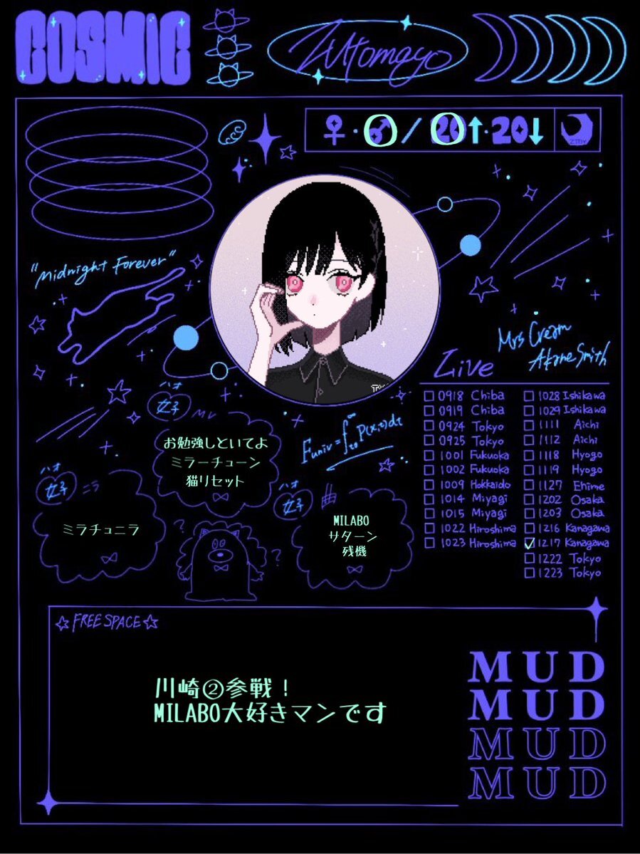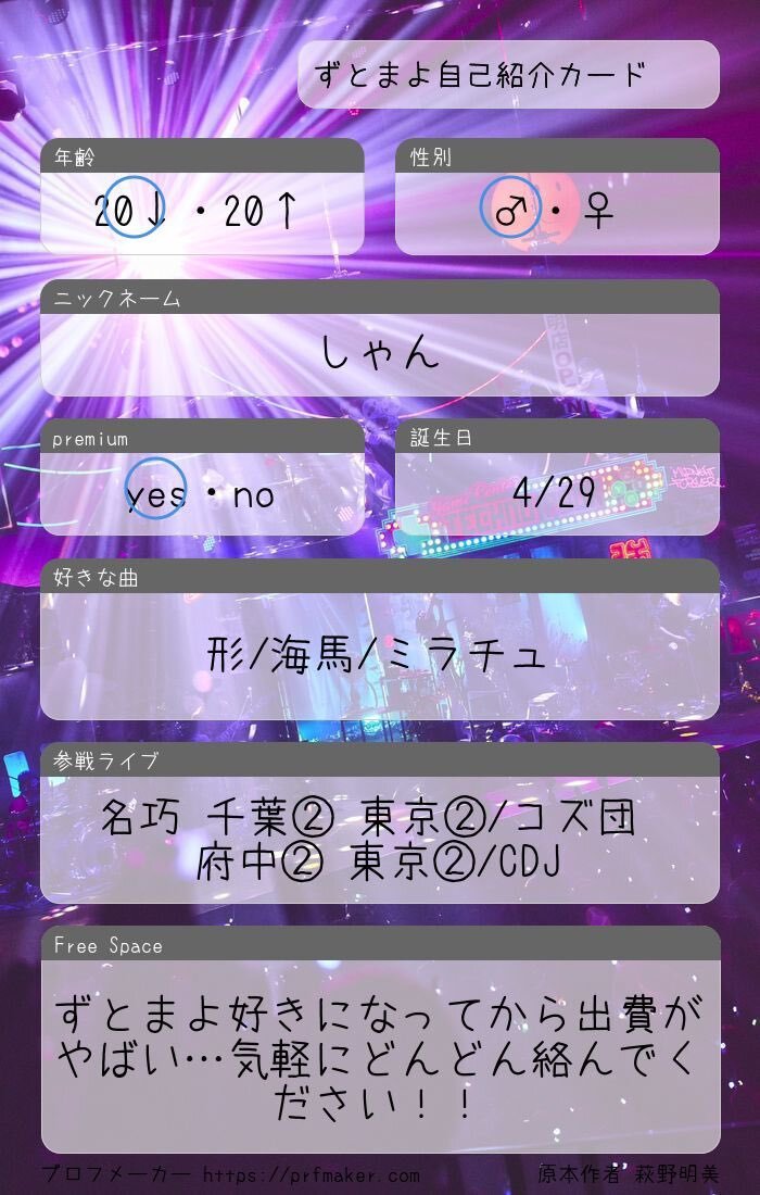 コズ団愛媛参戦します!初めてのライブで初心者ですが声掛けてくれたり仲良くしてくれたら嬉しいです!! 素敵なテンプレートお借りしました! #ずっと真夜中でいいのに #ずとまよ #ずとまよ好きと繋がりたい #ずとまろさんと繋がりたい #ずとまろ自己紹介カード pic.x.com/8KdF8EU9F2