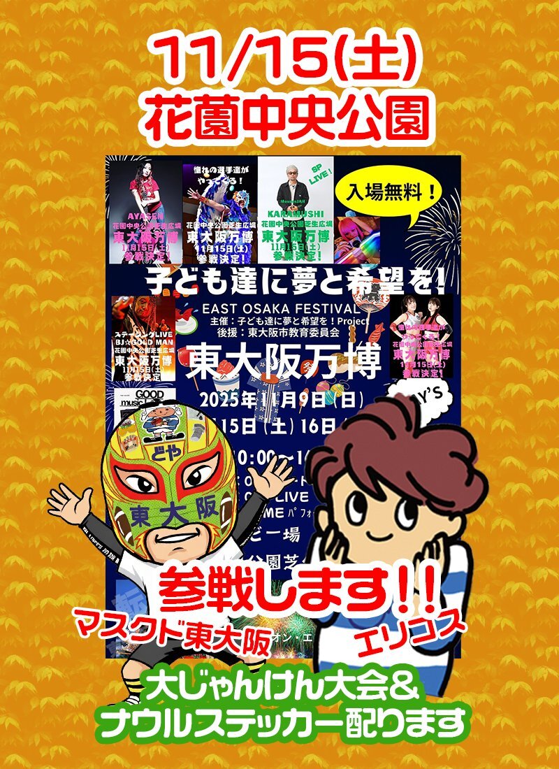 【#マスクド東大阪 #エリコス #東大阪万博 参戦】 11/15土曜 #花園中央公園 リングステージで布施プロレスPRと大じゃんけん大会やります 勝ち残った人には豪華賞品(タブン マスクド&トライくんのコラボグッズセットも提供 フードエリアはもちろん、音楽LIVEやプロレスも開催 ご来場お待ちしてます