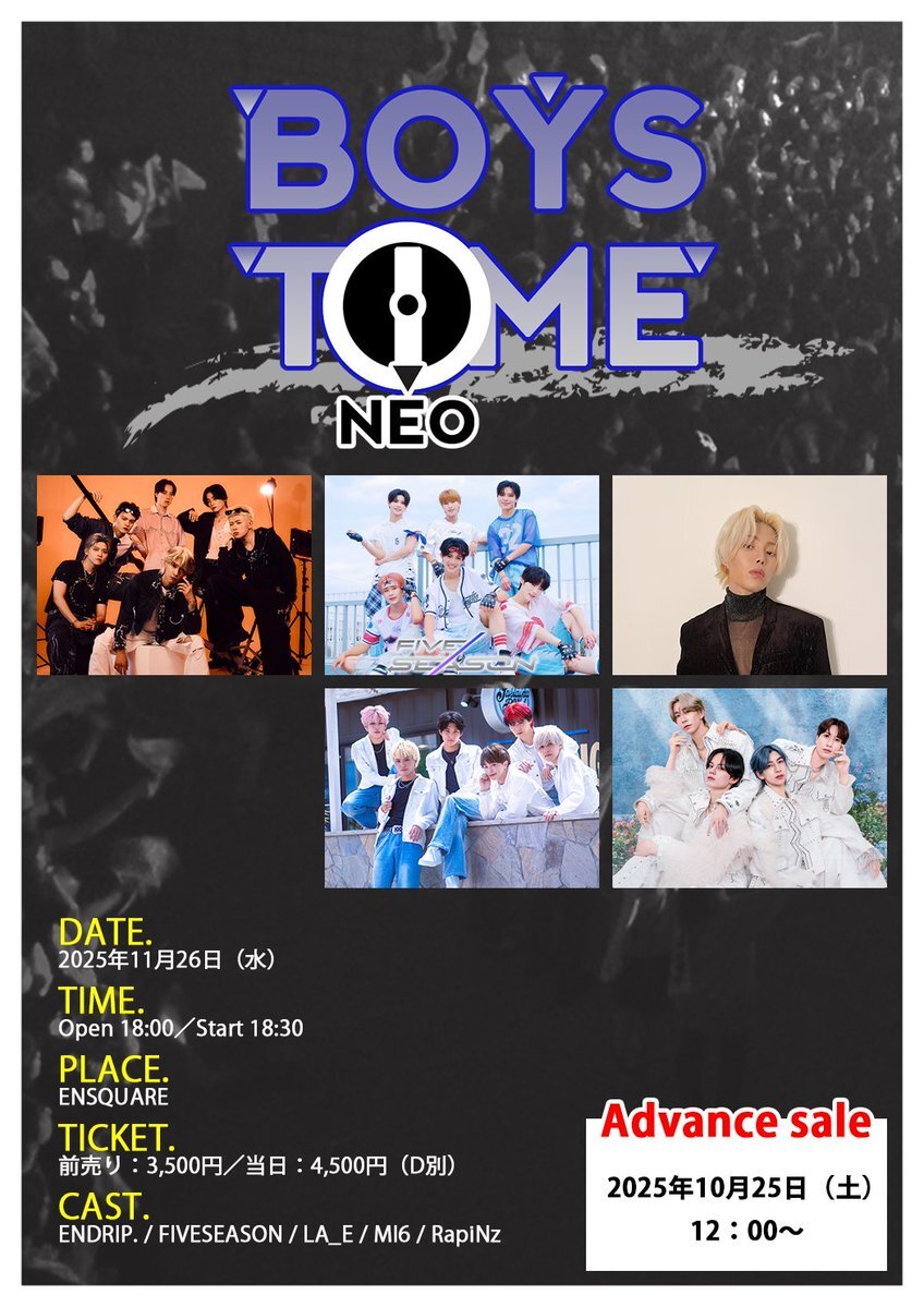 🎤ライブ出演情報🎤 ◤ ◥ 🗓️ 2025年11月26日(水) 🎤対バンライブ 「BOYS TIME NEO」 📍 ENSQUARE LIVE HALL 🚪 OPEN 18:00 🎤 START 18:30 ◣ ◢ 新大久保駅から徒歩3分の新しいライブハウス「ENSQUARE LIVE