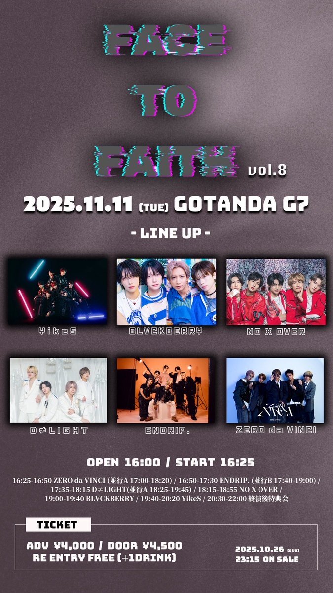 🎫ライブ情報🎫 🎤ライブ 16:50〜17:30 🗣️特典会 17:40〜19:00 「FACE TO FAITH vol.8」 日時:11/11(火) 会場:五反田G7 東京都品川区西五反田2-6-6 東洋ビルB1 OPEN16:00 / START16:25 【チケット代】 前売:¥4,000(+1D) 当日:¥4,500(+1D) 再入場可(要+1D) 🎫 10/26 23:15〜