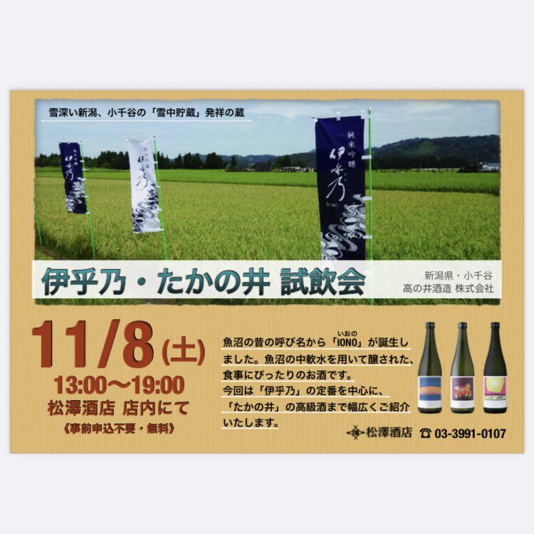 【伊乎乃•たかの井 試飲会】 ▶︎11/8(土) ▶︎13:00-19:00 ▶︎松澤酒店 今回は新潟県小千谷市の「伊乎乃•たかの井」のお酒をご紹介します。 皆様のご来店を心よりお待ちしております。 #伊乎乃 #たかの井 #高の井酒造株式会社 #練馬 #酒屋 #松澤酒店 #日本酒 #イベント #試飲会 pic.x.com/u0Wm8xuoEU