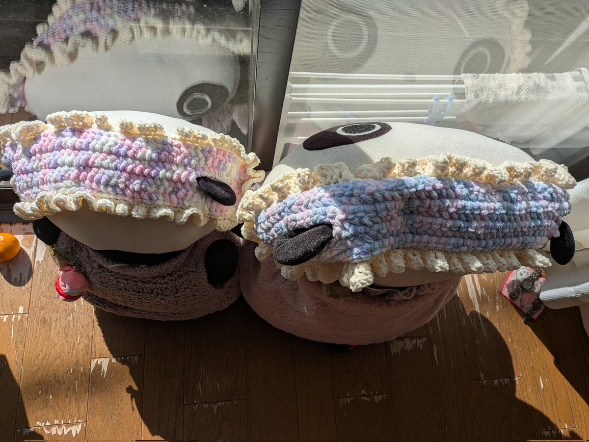 次女が小さめたれちゃんにも バブーシュカを作ってくれました 大きめたれちゃんとは色違いですね 2人並んでなんだか嬉しそう お天気が良いのでひなたれぼっこです #たれぱんだ #今日もよくたれています pic.x.com/czUEQQ1iPZ