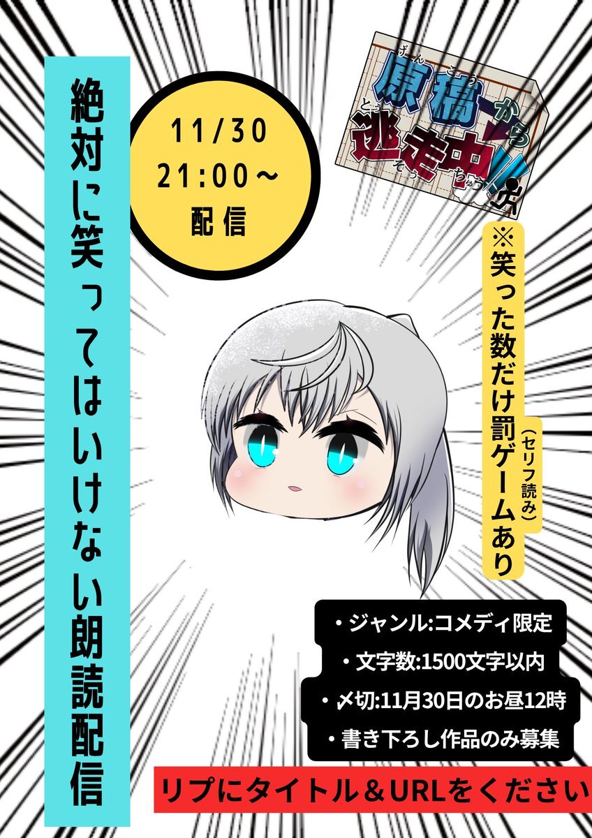 【お知らせ】 「絶対に笑ってはいけない朗読配信」第二弾やります!!! 配信は11月30日21:00~!(ゲストは前回と同じく相葉京介さんです!) 募集は11月30日の正午までです! ぜひぜひご参加ください🙌✨ #たんげつは原稿から逃走中 pic.x.com/ZPGPklimFa