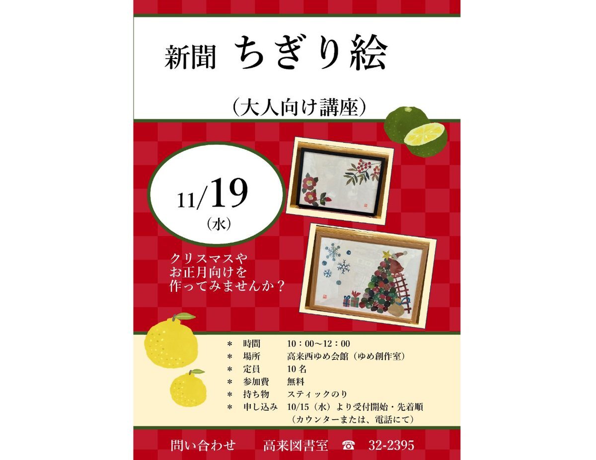 【高来図書室】『新聞ちぎり絵』 11月19日(水)10時から12時まで、『新聞ちぎり絵』の講座をします。クリスマスやお正月用の作品を作ります。5種類の見本の中から選んでの制作になりますので初めての方でもお気軽にご参加ください。 #諌早 #高来図書室 #講座 #ちぎり絵 pic.x.com/MCyh4PN675