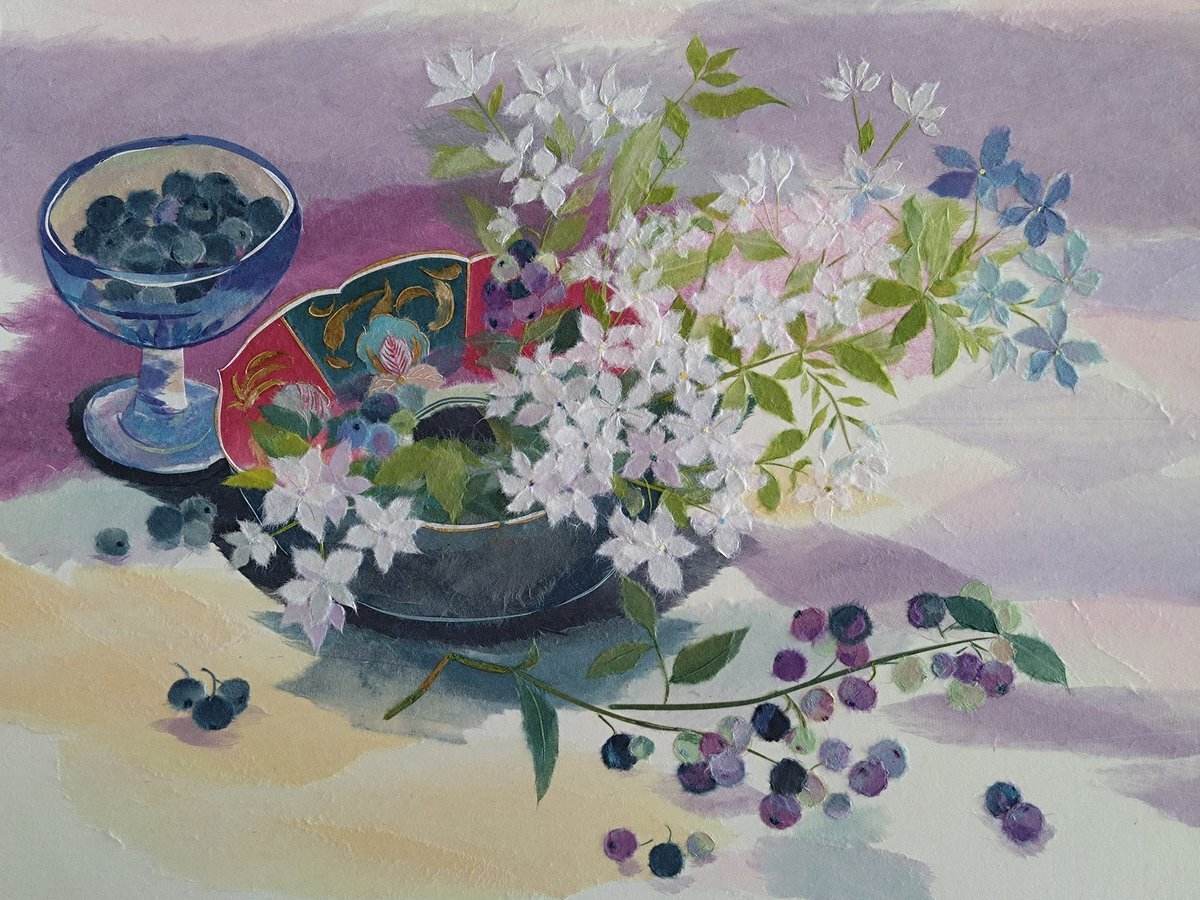 これにて完成と致します。 納得はしておりませんが、提出期限2日前なんで。 #ちぎり絵 #和紙 #ジャスミンとブルーベリー pic.x.com/xHRbfrgOmE