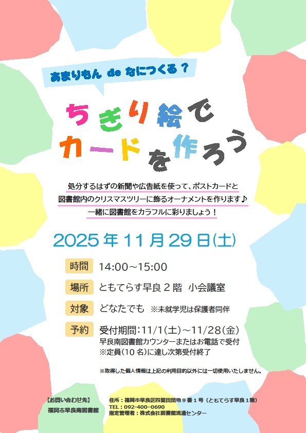 あまりもん de なにつくる? ちぎり絵でカードを作ろう 日時:11月29日(土)14:00~15:00 場所:ともてらす早良2階 小会議室 ただいま予約受付中です! 新聞や広告紙からカラフルなカードや飾りを作りましょう✨ 早良南図書館カウンターまたはお電話にてご予約ください💁 #ちぎり絵 #SDGs pic.x.com/u35vIJZp6n