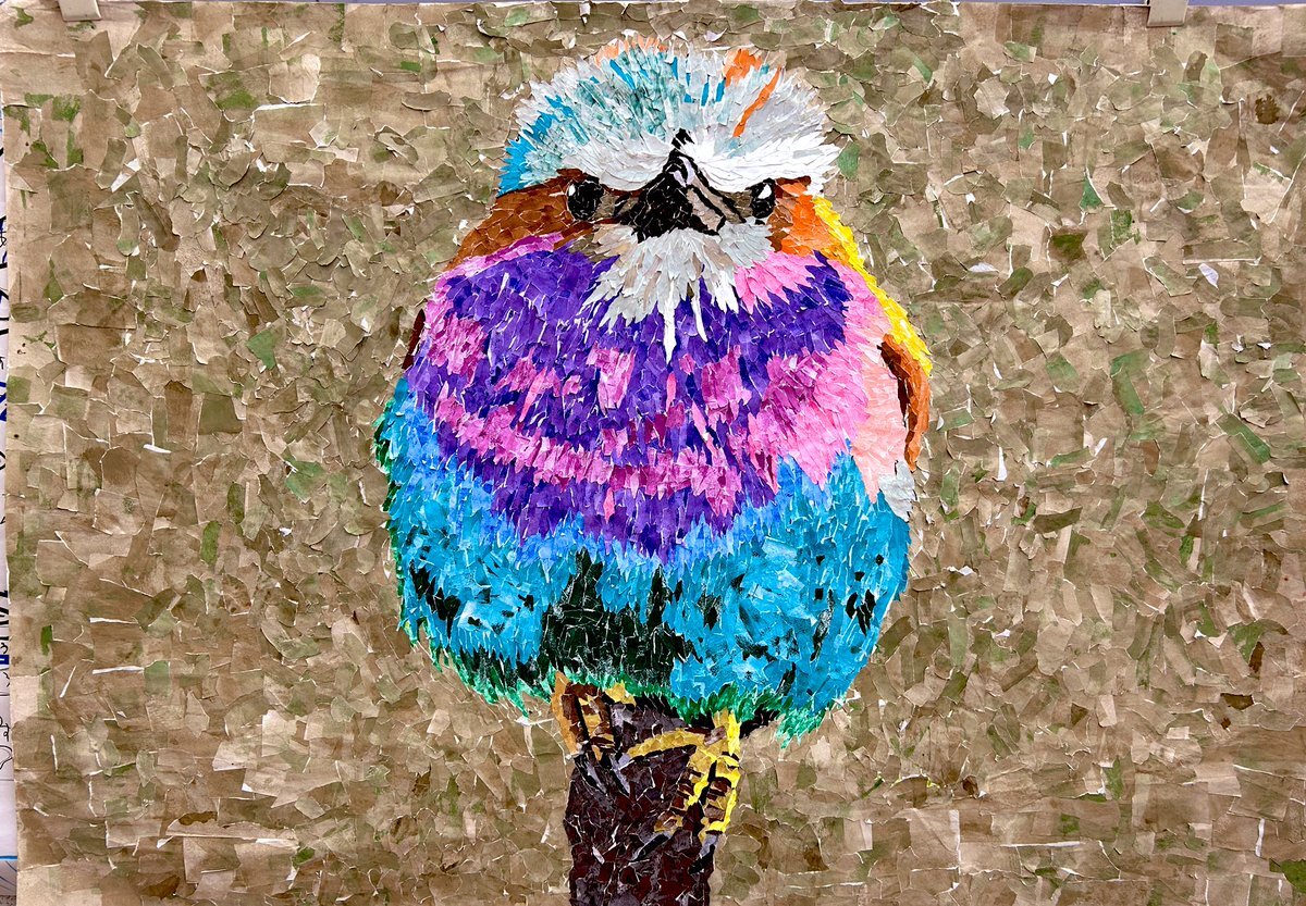 本業で作った模造紙2枚分のちぎり絵。約1ヶ月かけて利用者さんと一緒に作りました。利用者さんの底力を感じる作品。 #ちぎり絵 # #ライラックニシブッポウソウ pic.x.com/sA6Ql2Ok0u