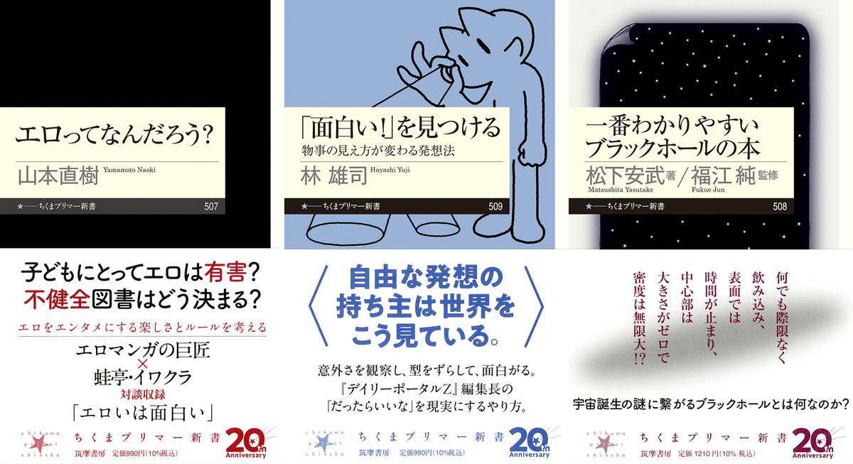 \本日/ 11月新刊の発売日です!書店へ🏃 山本直樹『エロってなんだろう?』 chikumashobo.co.jp/product/978448… 林雄司『「面白い!」を見つける——物事の見え方が変わる発想法』 chikumashobo.co.jp/product/978448… 松下安武(著)/福江純(監修)『一番わかりやすいブラックホールの本』 chikumashobo.co.jp/product/978448…