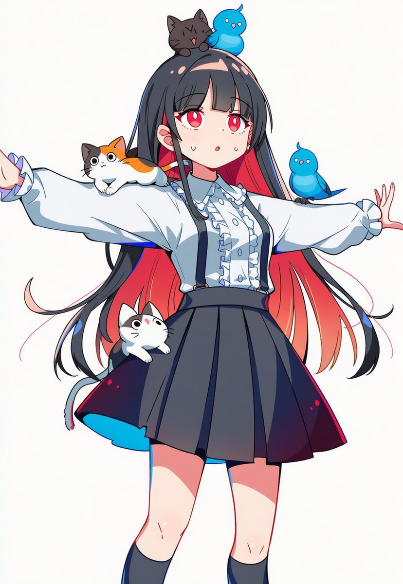 使えるかもしれないプロンプト(NovelAI V4.5 Full) 「cat on shoulder」 猫を肩に乗せている場合。 「bird on shoulder」 鳥を肩に乗せている場合。 「spread arms」 キャラクターが両腕を左右に広げます。 「t-pose」 Tポーズ。 両腕を広げて体全体でTの字を描くポーズ。
