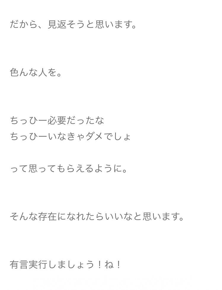 ちっひーのこの言葉にビビッと来て、ちひらーになりたい!!そう思って早8年 そこから本当に色んな人を見返し、ひたすら有言実行するちっひーの姿は、めちゃカッコよくて、そんなちっひーを応援できて幸せです👍 これからもずーーっと、私にとって唯一無二の推しです!☺️ #ちっひーの想い出 #1 pic.x.com/dPclcwvNkn