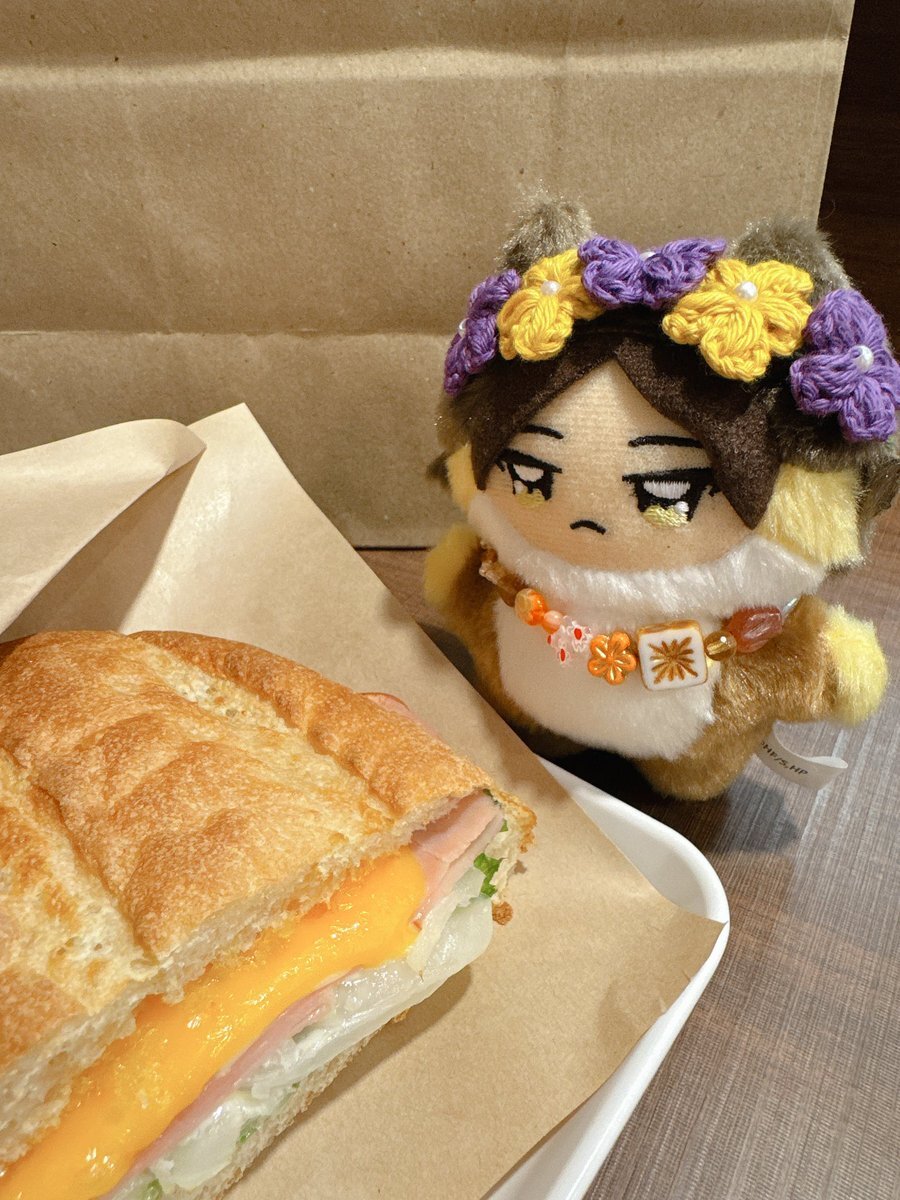 📱「かいぬし…おれ、🍠の🥐がたべれるってきいてついてきたんだけど?」(新作!おいもカラーフラワーのヘッドドレスを添えて…) ごめんね、ちみすな。飼い主はハムチーズハンドがどうしても食べたかったから、🥐はお持ち帰りにしたよ。 お家で食べようね #ちみけも手芸部 #ちみけものいる暮らし pic.x.com/GWuQ4nDSYs