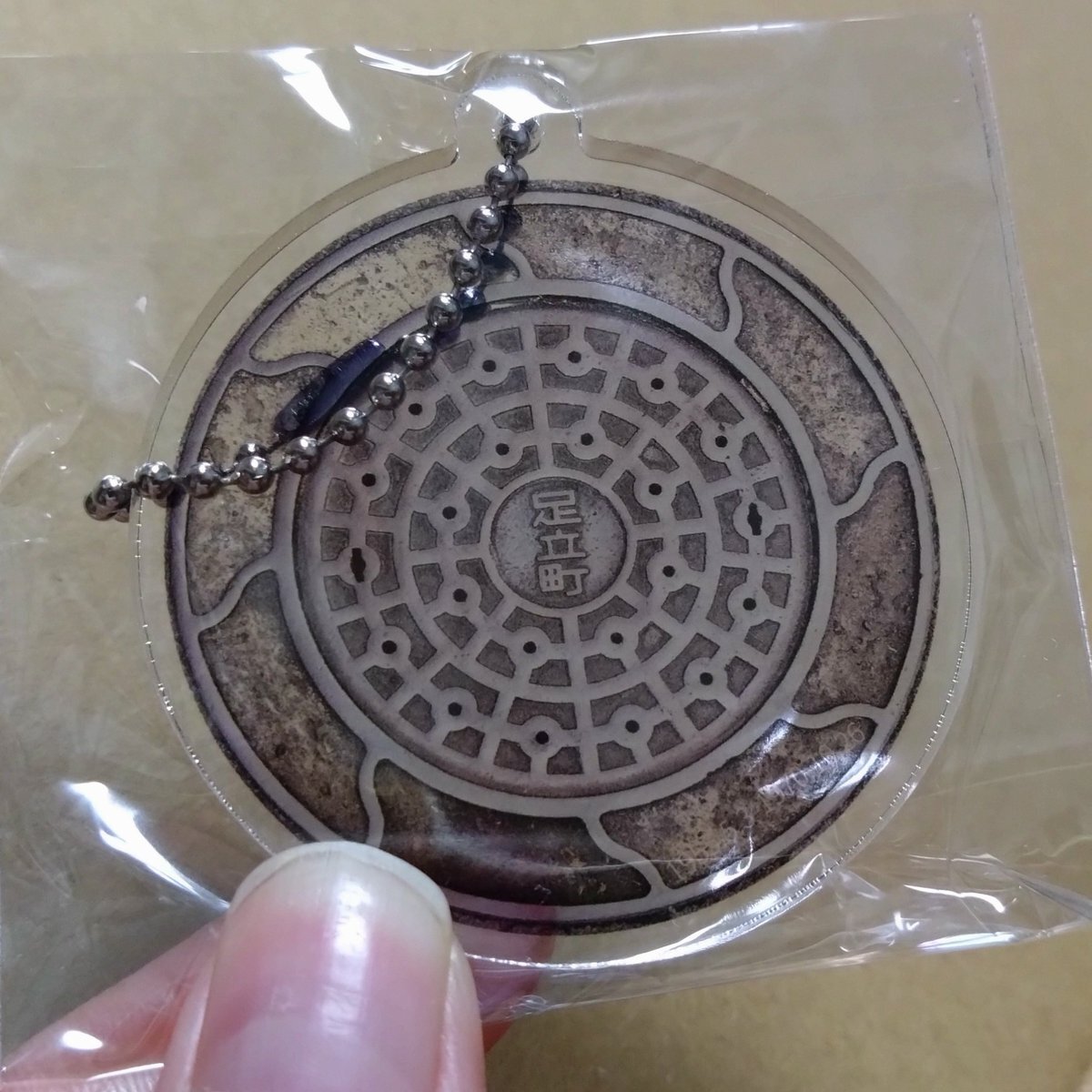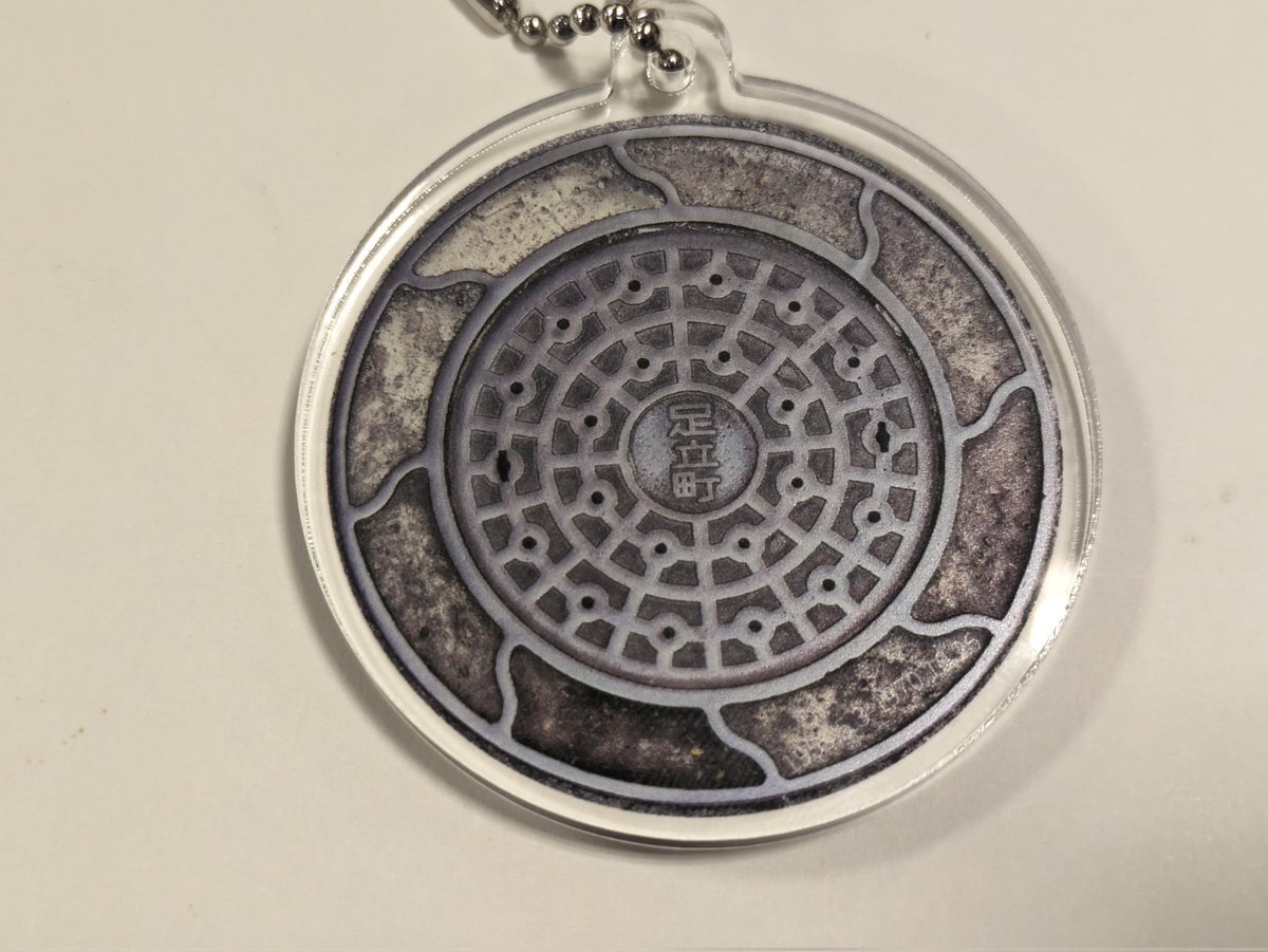 #マンホールナイト の旧足立町(埼玉県志木市)の蓋を見つけました!特典でいただいたチャームです。 お気に入りの蓋をこんな感じでチャームにできれば、いつでも持ち歩くことができて良いですね! #しき鉄蓋散歩 #ちょっと古い蓋 pic.x.com/tumiLbzUOy