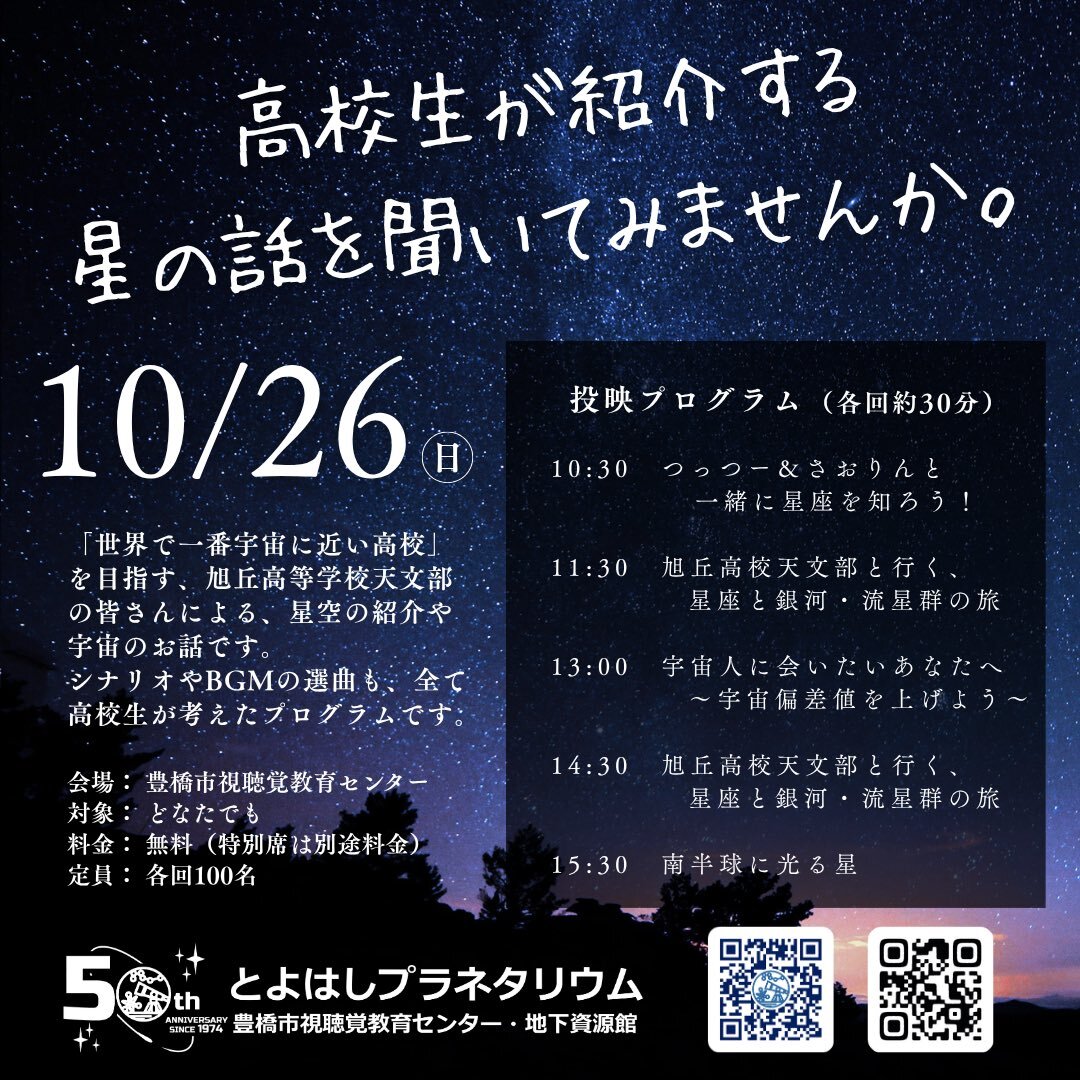 明日は高校生による プラネタリウム生解説!!! 旭丘高校の天文部が担当です✨ お楽しみに!!! 以下の一般番組の投映はありませんのでご注意ください。 #おしりたんてい コズミックフロント #ちびまる子ちゃん 南十字星に魅せられて 星はここにある music by #ACIDMAN #ちょっと星空見てみりん pic.x.com/EBuXC1uITy