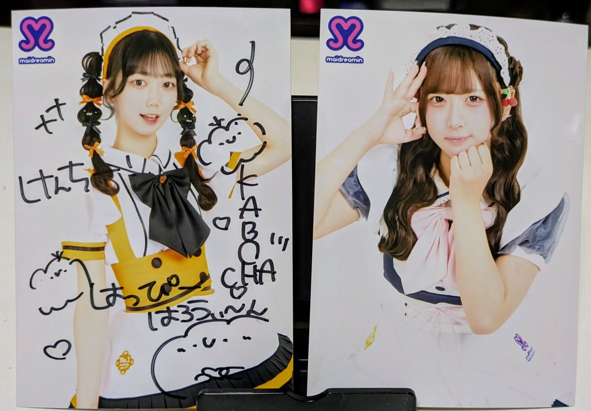 けんちのニュウコク後記251027 今日は ひまわりちゃん(ブロマイドに書いてもらったのは初) あめりちゃん(本日初入荷) のブロマイドと きり💛あむ🧡ツーショのお茶爆画像 をお迎えさせもらいました🥰 #めいどりーみんAKIBA #ちーむあきば pic.x.com/h0XGIRDS91