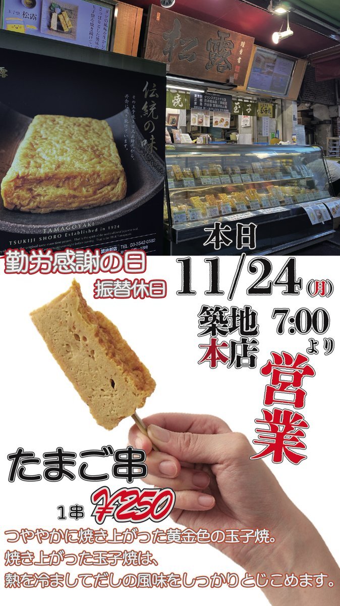 本日11月24日(月)勤労感謝の日の振替休日にて連休となっておりますが,#つきぢ松露 築地本店<7:00-15:00>にて営業となっております🈺 #築地 散策へお越しいただいた際には,食べやすく串に刺さった「#たまご串」もどうぞお楽しみください🌟 #松露 #築地場外市場 #たまごやき
