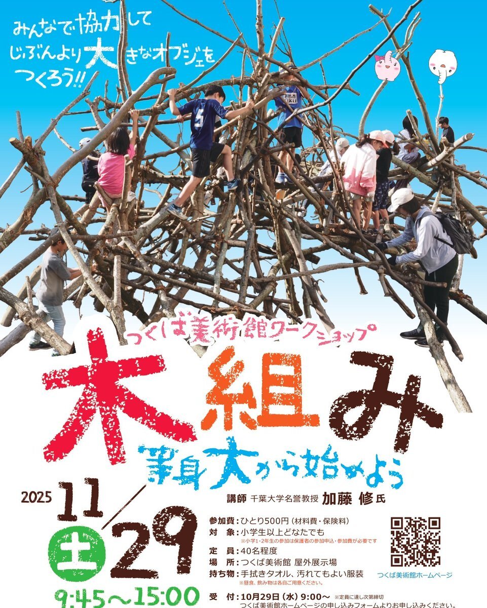 #つくば美術館 では11月29日(土)9:45から15:00までワークショップ「木組み 等身大から始めよう」を開催します。講師は千葉大名誉教授 #加藤修 氏。自然木を組み合わせてみんなで大きなオブジェをつくります。対象は小学生以上40名。参加料一人500円です。申し込みはHPから⇒tsukuba.museum.ibk.ed.jp/event.html#eve… pic.x.com/bnbHwsVtEy