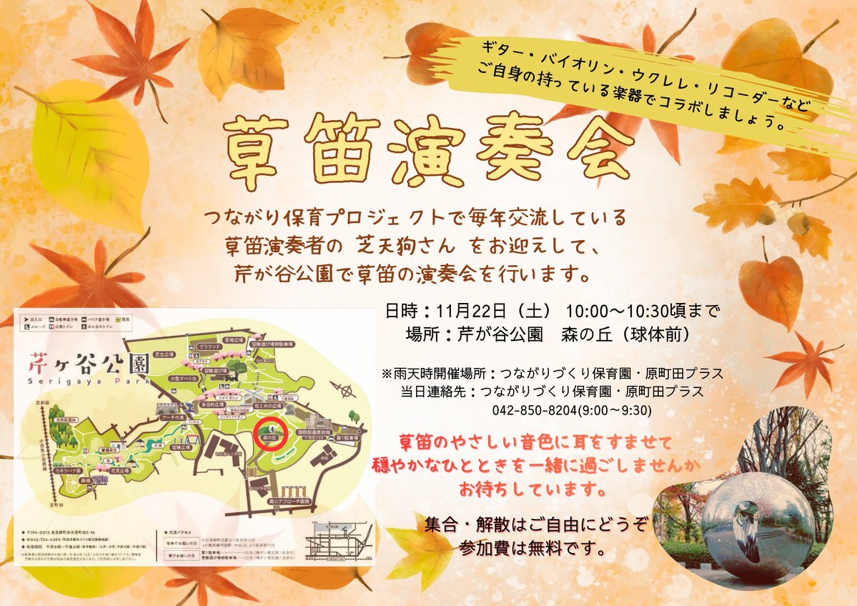 🌿#つながり保育プロジェクト町田 が毎年お迎えしている #芝天狗 さんによる #草笛演奏会 を開催します🎵 ギター・バイオリン・ウクレレ・リコーダーなど、楽器をお持ちの方はぜひ一緒にコラボしませんか♪ 📅 11月22日(土)10:00~10:30 📍#町田市が谷公園(球体前) 🕊 集合・解散自由/🎵参加無料 pic.x.com/NZkFnSmlFm