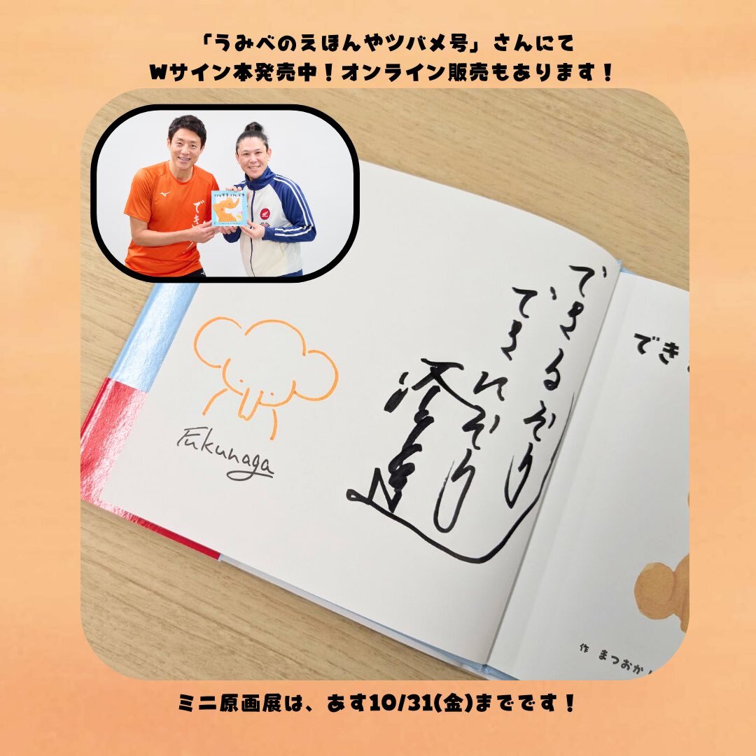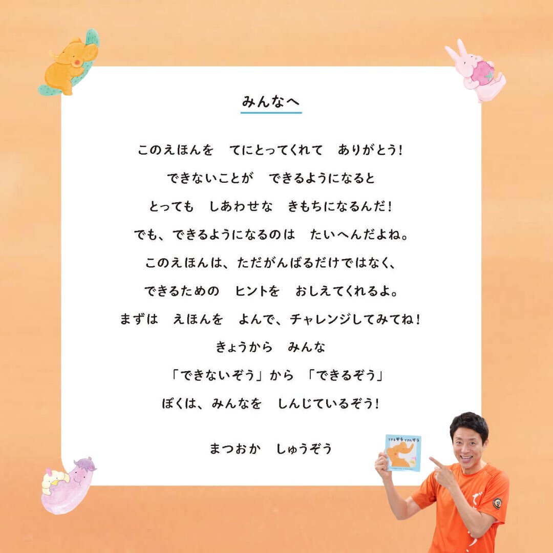 / 松岡修造より👀 子どもたちへのメッセージ🔥 \ ➡️画像2枚目をチェック✅ 絵本『 #できるぞうできたぞう 』🐘 ✨ #松岡修造 作 #ふくながじゅんぺい 絵 🎨ミニ原画展 🗓️いよいよ明日10/31まで サイン本は @tsubamegou さんのオンラインショップでも発売中✍️ pic.x.com/BZX4sp8iCP