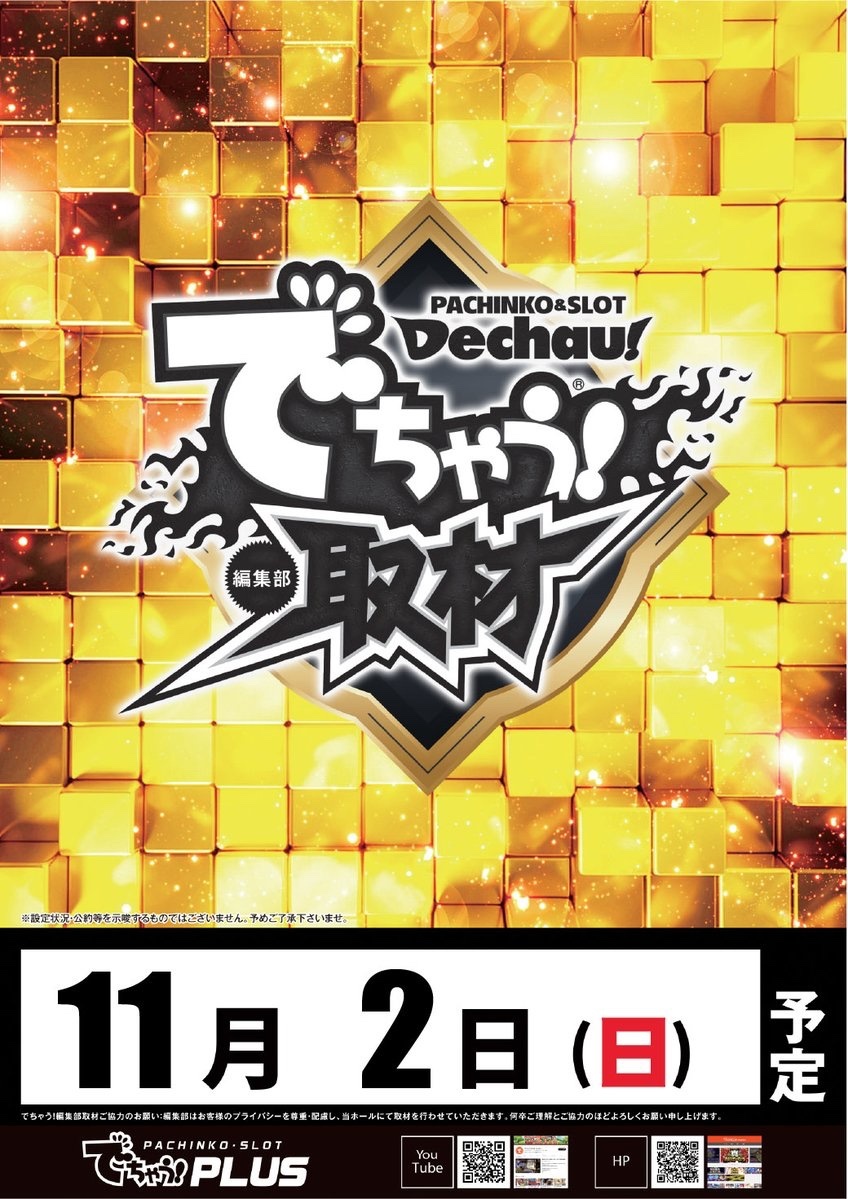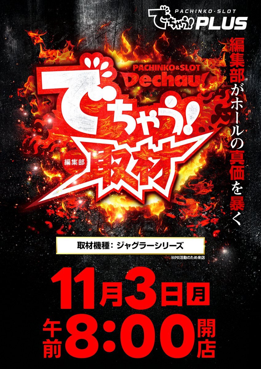 1⃣1⃣月1⃣日 土曜日 10時オープン🌟 明日は #でちゃう編集部取材 予定です📷💥 対象機種【ジャグラー🤡&沖ドキ🌺】 18時30分からはカウンター横で 🍩お菓子🍪販売もあります😋🎶 ご来店お待ちしております🥰 pic.x.com/h1cbX4c4MJ
