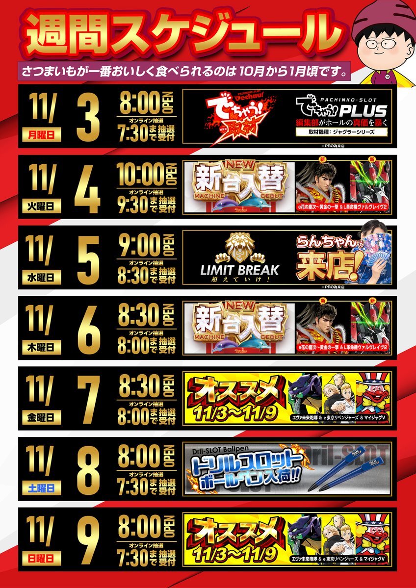 どーも副🍠です。 明日は1⃣1⃣月3⃣日(月) 『8⃣:0⃣0⃣』OPEN‼️ ✅『#でちゃう編集部取材』※PRの為 取材機種:ジャグラーシリーズ🤡 ✅『#来週のスケジュール🗓️』 ✅『#来週のオススメ✨』 はこちら⤵️⤵️⤵️ はい、でちゃう💕😆 朝からのホレンジャー求む🫡 pic.x.com/f3In77qohU
