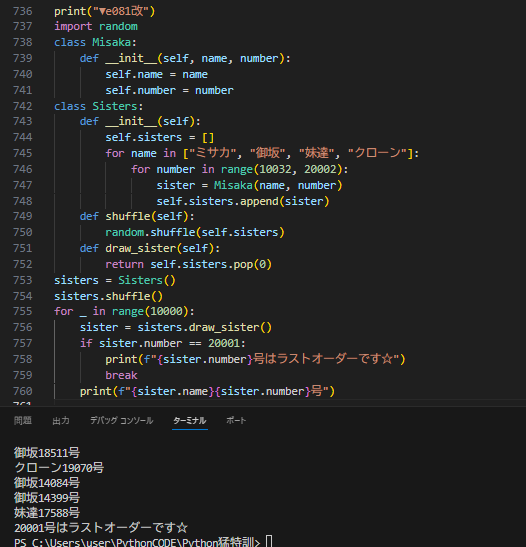 🔻Python100本ノック byサプーさんの動画 100本ノックも残り19本💫 81問目をトランプVersionからシスターズVersionに変えてみたw【ついでに、20001号がヒットしたら 🔸20001号はラストオーダーです☆ と表示しbreakするよう仕様変更⬇️ #とある魔術の禁書目録 #とある科学の超電磁砲 #Python pic.x.com/5uCBHUIBzi