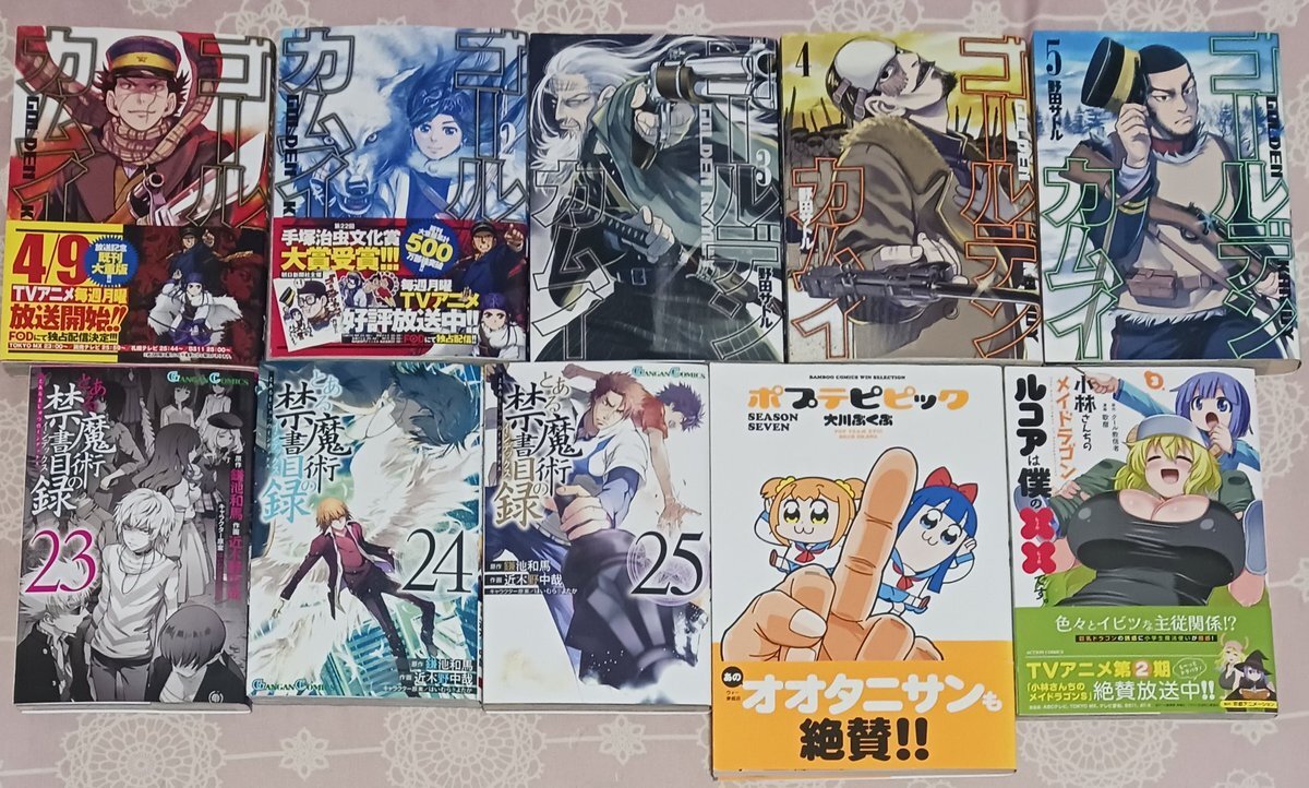 #今日買った漫画 1/2 #ポプテピピック #小林さんちのメイドラゴンルコアは僕の✕✕です。 3 #ゴールデンカムイ 1~5 #とある魔術の禁書目録 23~25 #漫画好きと繋がりたい pic.x.com/IUs10JJMXN