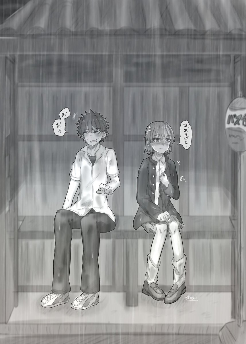 アンケートありがとうございました‼️ ということで、土砂降りに当たってしまい2人でバス停で雨宿りすることになったけれど、美琴さんのシャツが透けてしまっていることに気付いた上条さんと、何か美琴さんがしおらしくて変な雰囲気になってしまった上琴的な何かです(早口) #とある魔術の禁書目録 pic.x.com/3T2IaNOhdF x.com/Degbli/status/…