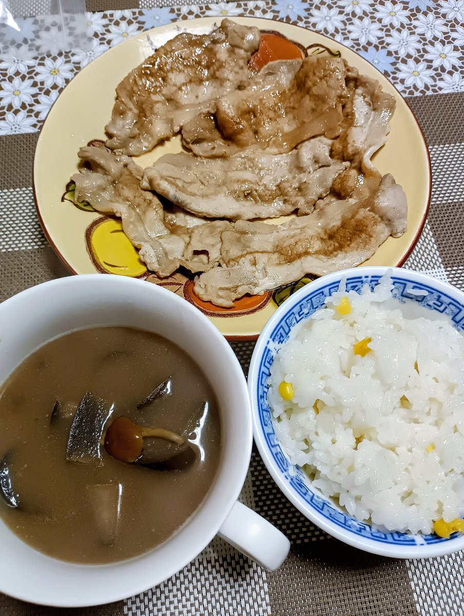 今日は、15℃☀☁…肌寒い日でした😔 昼食は、ロース🐷ソース辣油焼き&なめこ🍄・昨日収穫した🍆の味噌汁を😋#家庭菜園 🍚は、🌽を入れて炊きました😊 #とうもろこし #とうきび pic.x.com/ZqJUJH6kjA