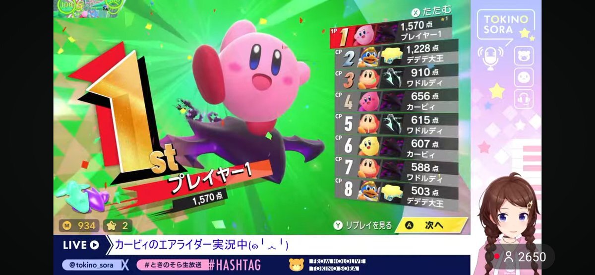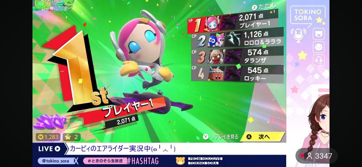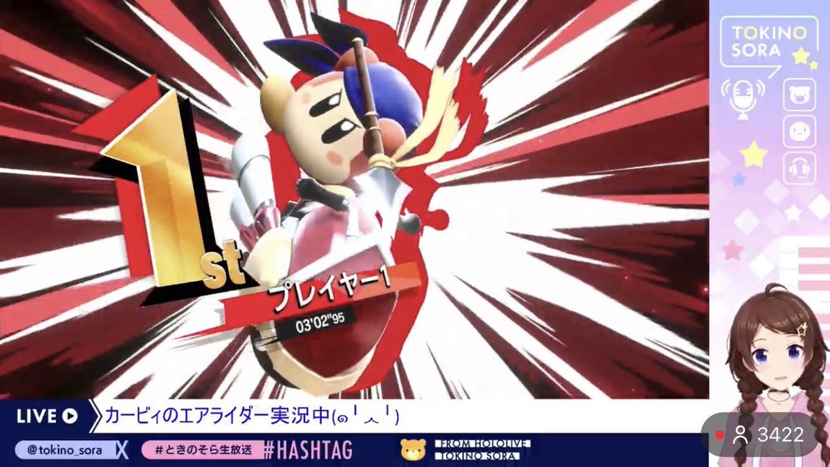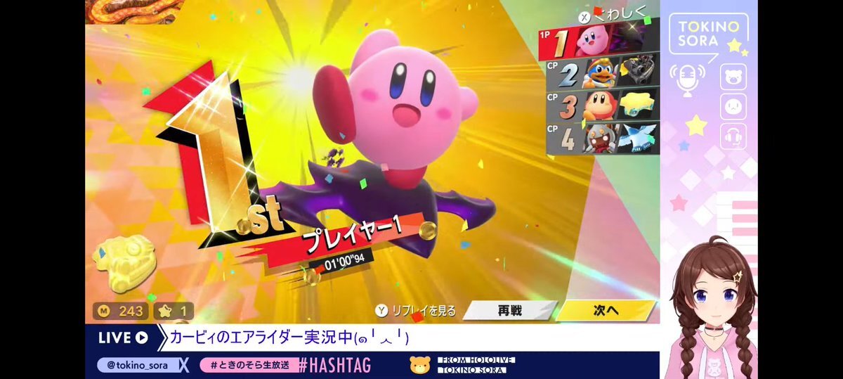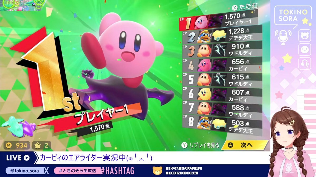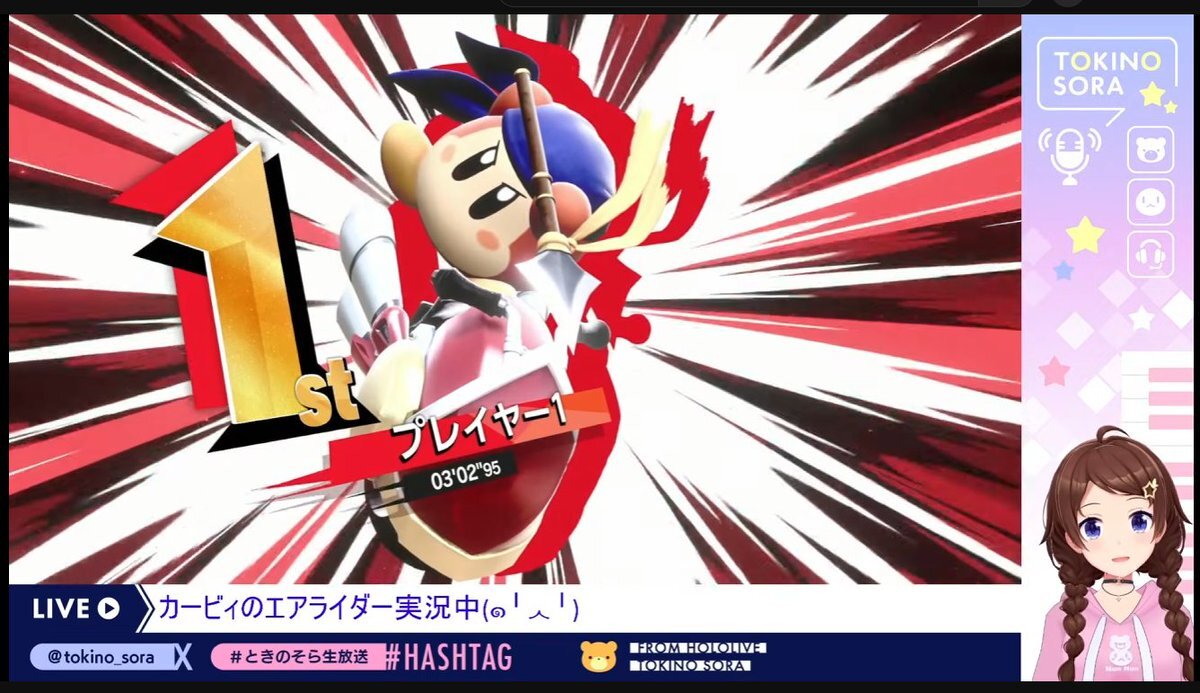 カービィのエアライダーお疲れ様でした! 可愛いキャラがいっぱいだしゲームモードも色々あって凄く楽しかったよ 可愛い二つ名も決まって良い感じ! 次回も楽しみにしてるね! #ときのそら生放送 pic.x.com/qYAgKEX78G