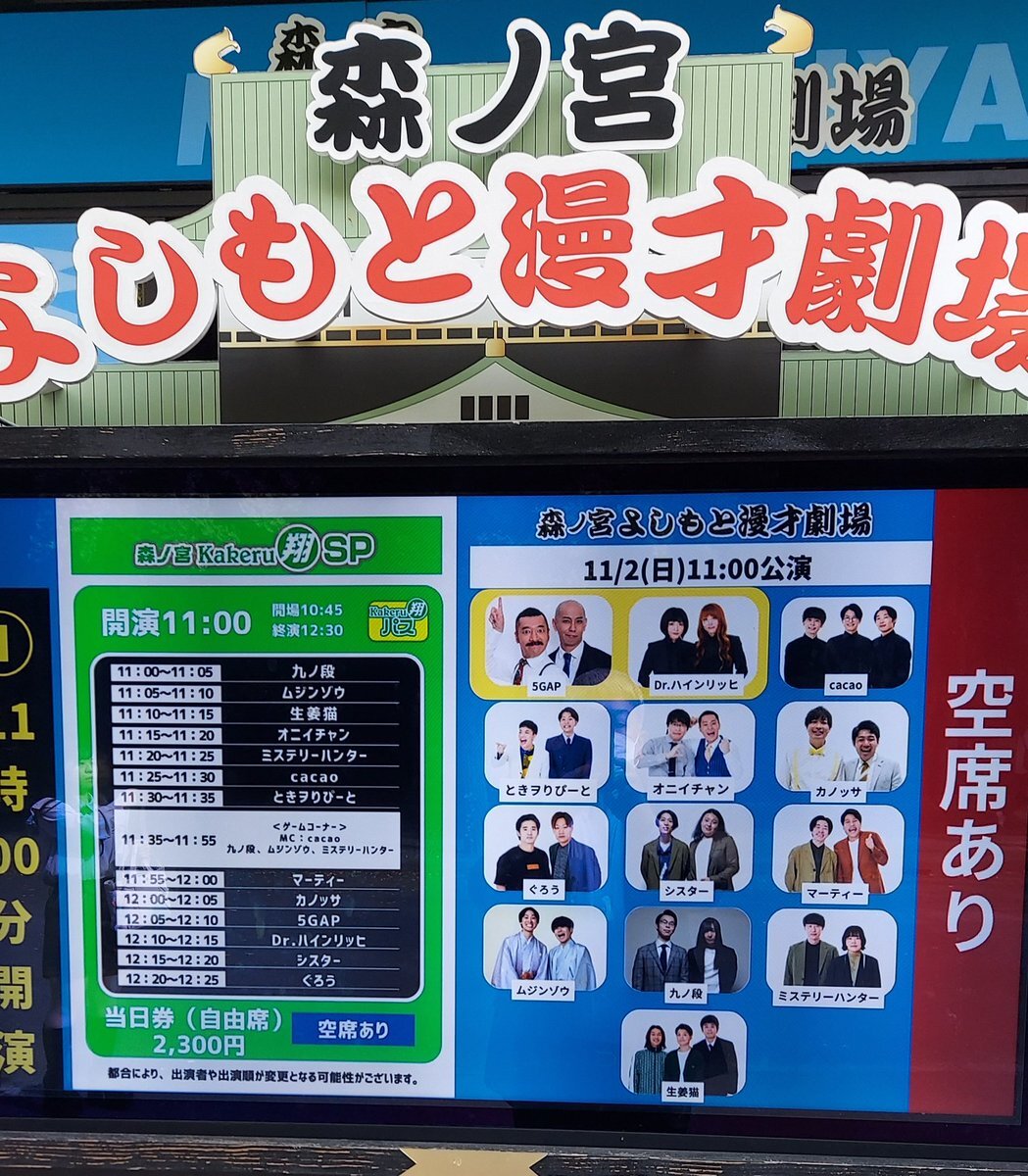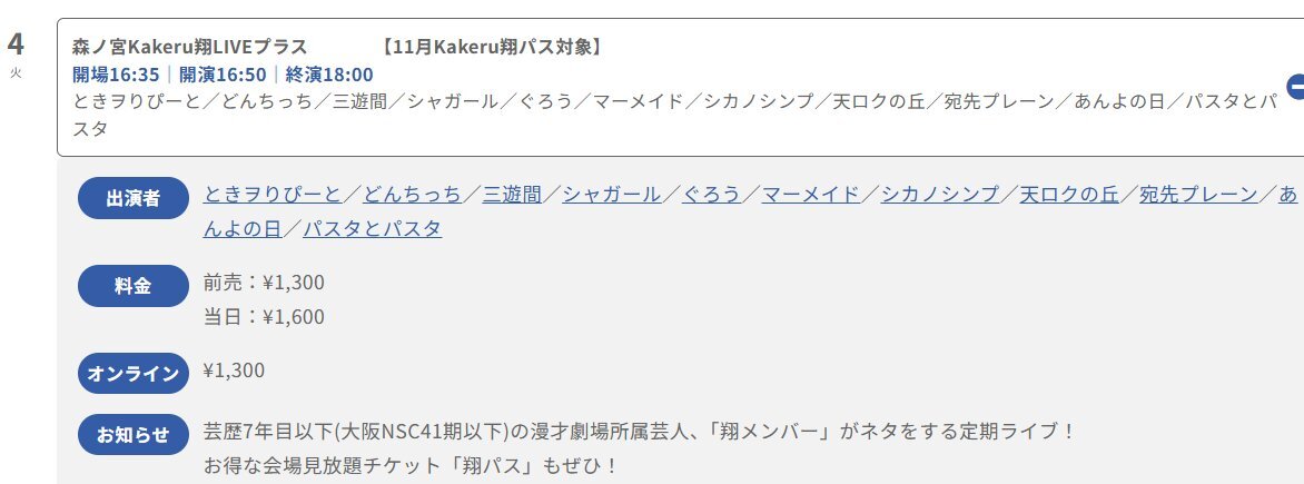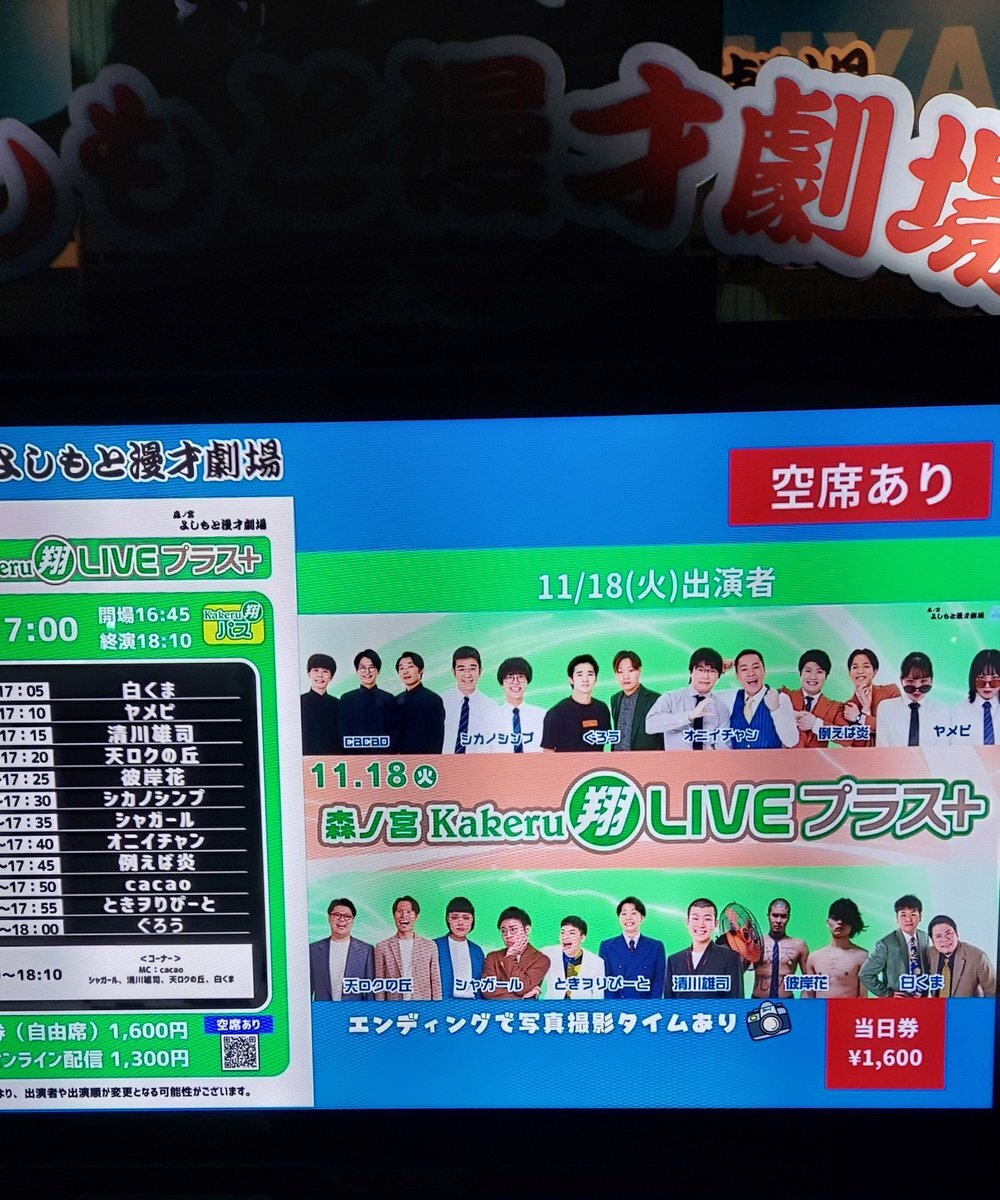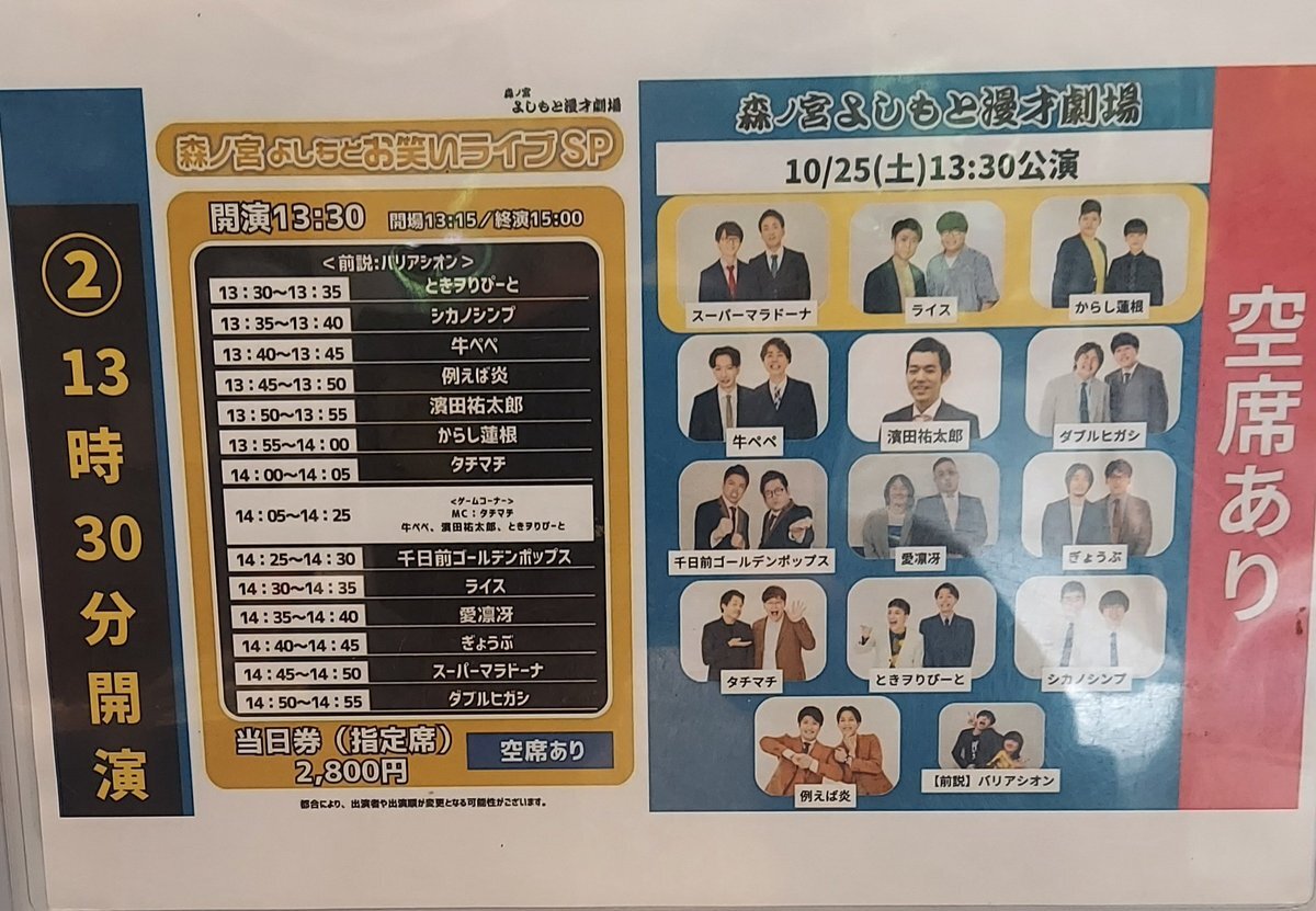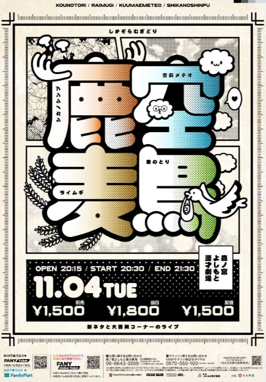 🏯11/4(火)の公演情報🏯 #森ノ宮よしもと漫才劇場 16:50~森ノ宮Kakeru翔LIVEプラス 当日券¥1,600 18:30~森ノ宮シックスライブ 当日券¥1,800 20:30~鹿空麦鳥 当日券¥1,800 当日券購入は👉x.gd/U6lja #CJPO #ときヲりぴーと #吉田たち #空前メテオ #どんちっち #デルマパンゲpic.x.com/lh6CPxNQYg