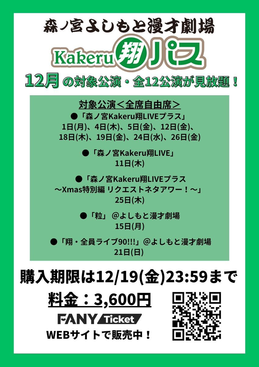 / 12月の「森ノ宮Kakeru翔ライブ」 全12公演が見放題👀 + 「翔・全員ライブ90!!!」「粒」 @よしもと漫才劇場も 対象🎟️ \ 12月の翔パスカードは #ミステリーハンター #あんよの日 の2組 12/1(月)森ノ宮Kakeru翔LIVEプラス 終演後から引き換え開始! 森ノ宮よしもと漫才劇場の受付で