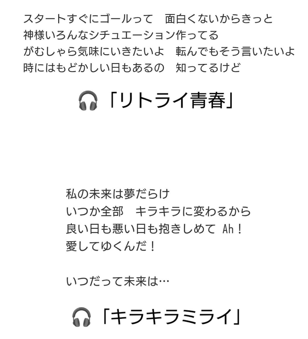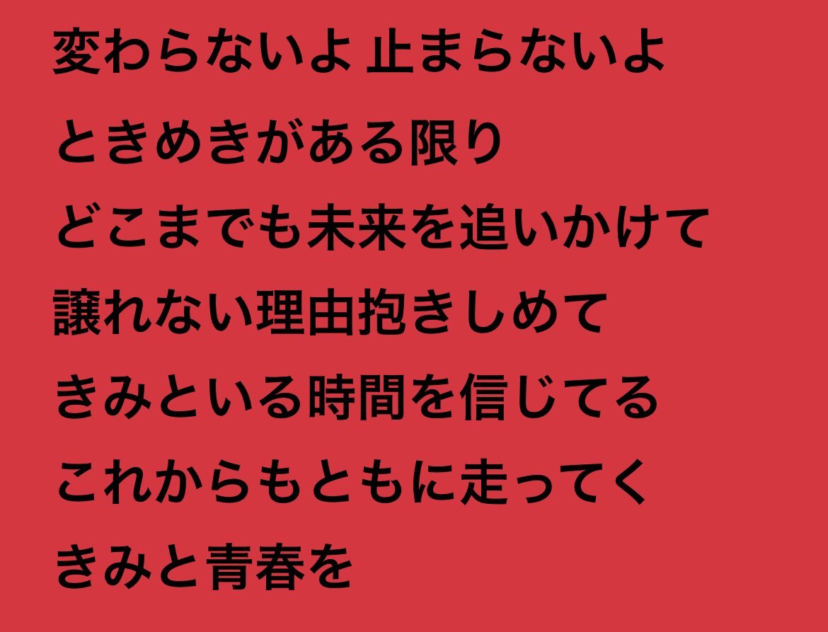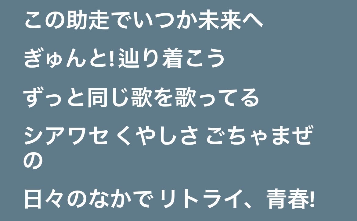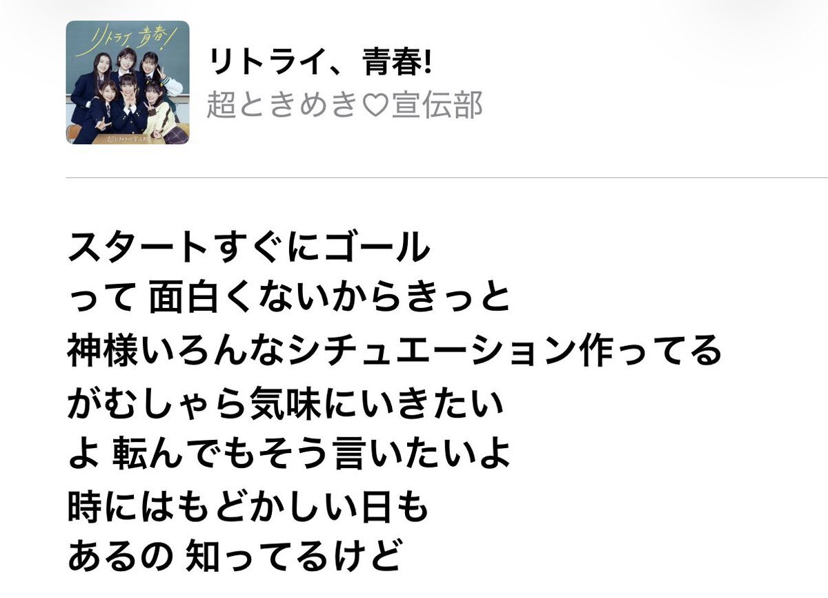 「リトライ、青春!」の2番サビ いつか貰った勇気のぶんまで 本気のエールを送るから 前だけ見て リトライ青春! 始めようよここから 頑張る鼓動 耳澄まして 一人じゃない だから! 何度でも ワープできる スタートへと! #とき宣の歌詞は超最強