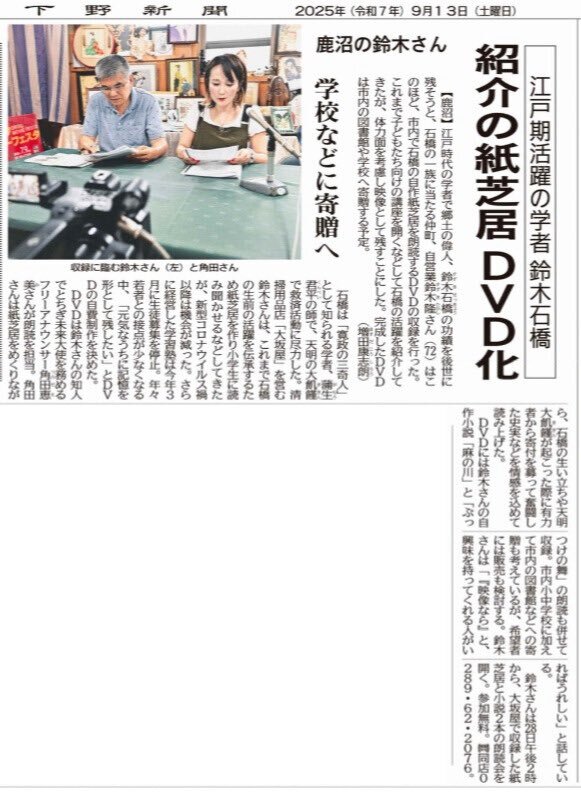ナレーションの仕事をしてきました🎙️本日、下野新聞の紙面に掲載されました。依頼は15代続く老舗 鹿沼ほうき店 大坂屋夢箒店 鈴木さんからです。鈴木さんの自作小説2本と紙芝居がDVDになる予定です。ぜひご覧頂けたら嬉しいです。#フリーアナウンサー #とちぎ未来大使角田恵美 #栃木のえがお広報官 pic.x.com/dptbp6shio