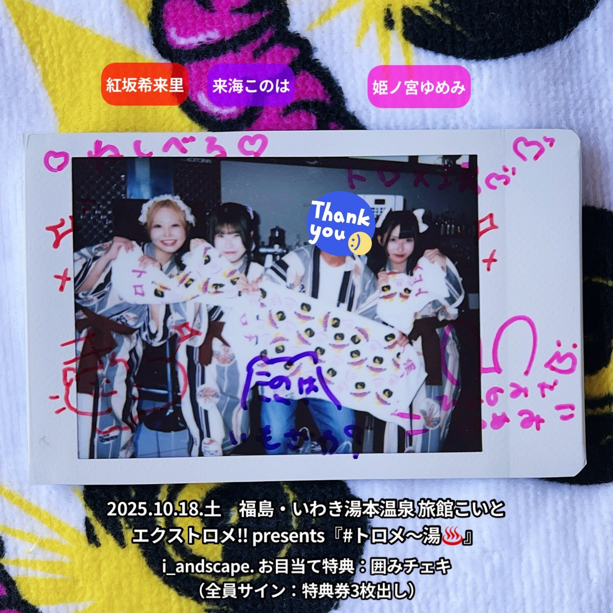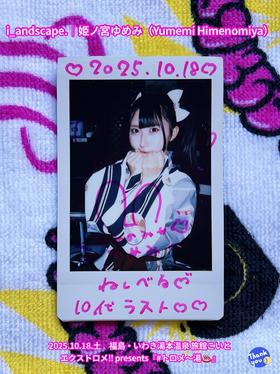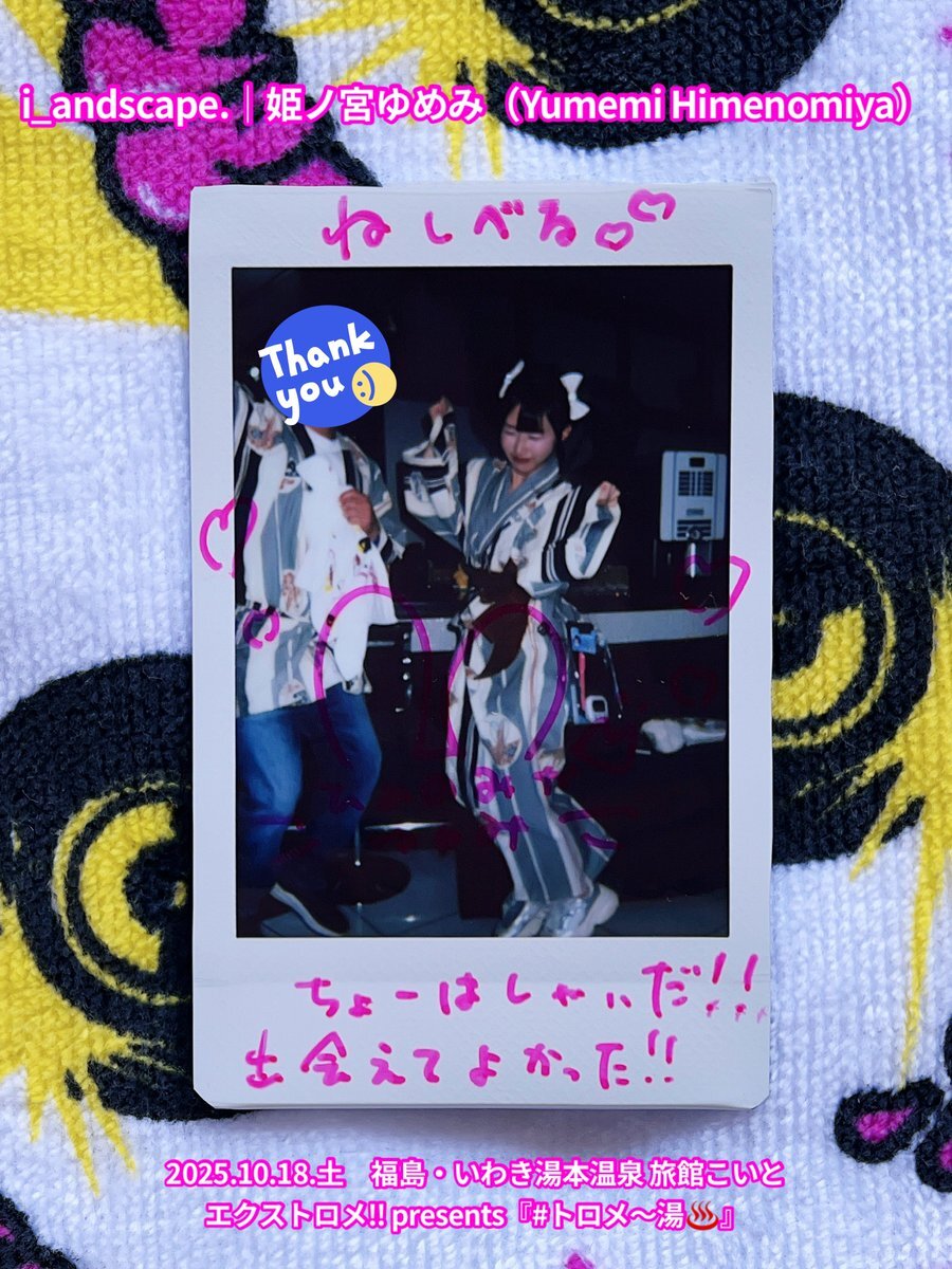 2025.10.18.土 #チェキ 2/2 エクストロメ‼︎ presents『#トロメ〜湯♨️』 福島・いわき湯本温泉 旅館こいと \また出演できますように/ #i_andscape #ランドスケープ #来海このは #ほくほくこのは 💜 #紅坂希来里 #とっとこきらり ❤️🔥 #姫ノ宮ゆめみ #ゆめみ本日の猪突猛進 💖 #仙台 #アイドル pic.x.com/FjM4pIsDBa x.com/i_andscape/sta…